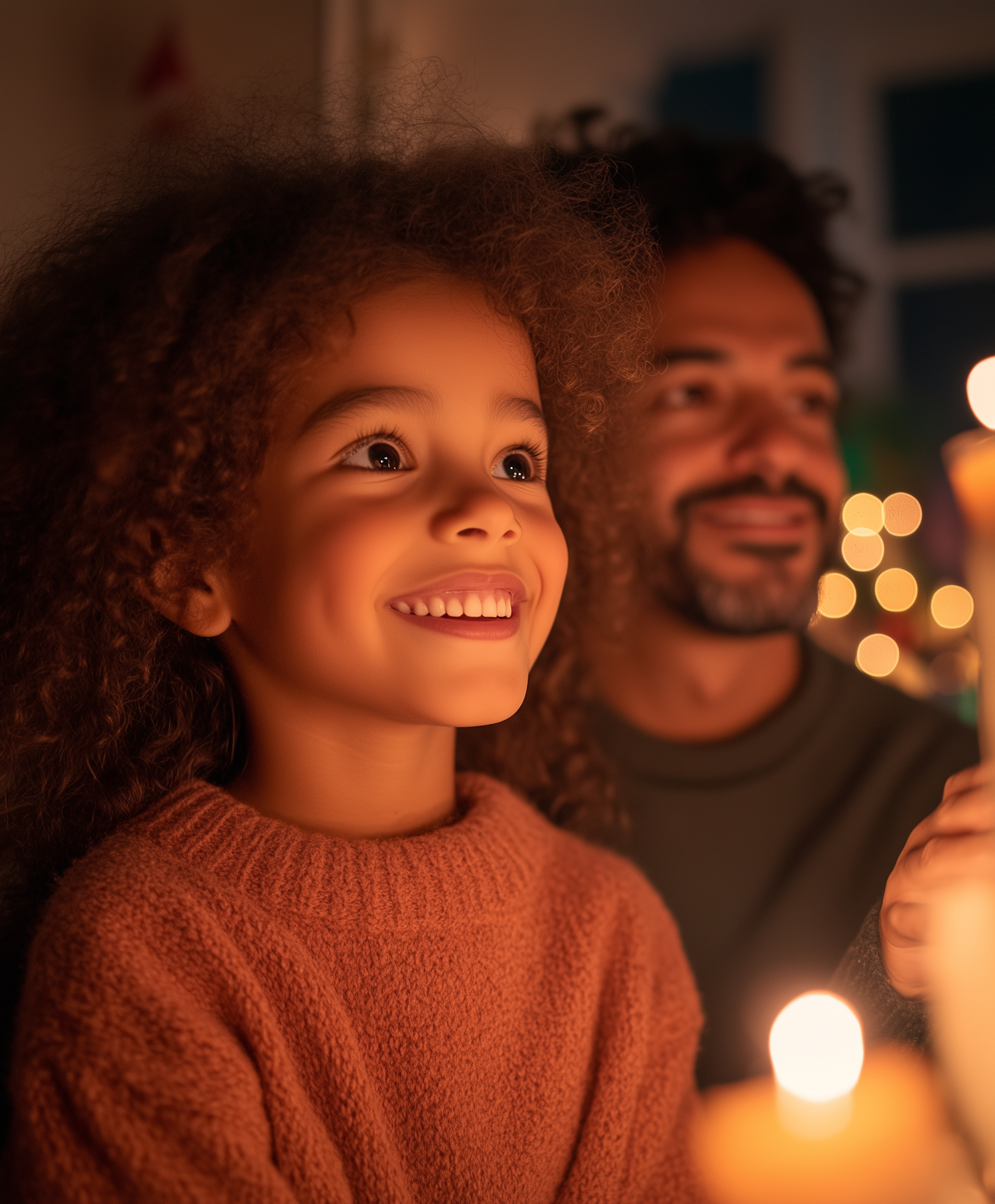 A joyful child and a man enjoy a warm, candlelit moment, surrounded by festive lights, creating a cozy and intimate atmosphere.