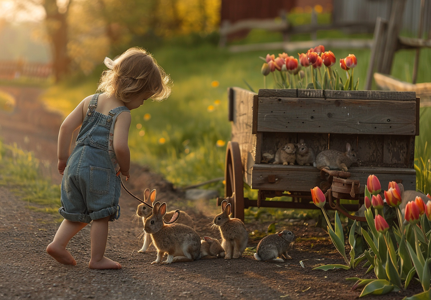 A child in denim overalls plays with rabbits near a wooden cart and tulips, bathed in warm sunlight in a rural setting.