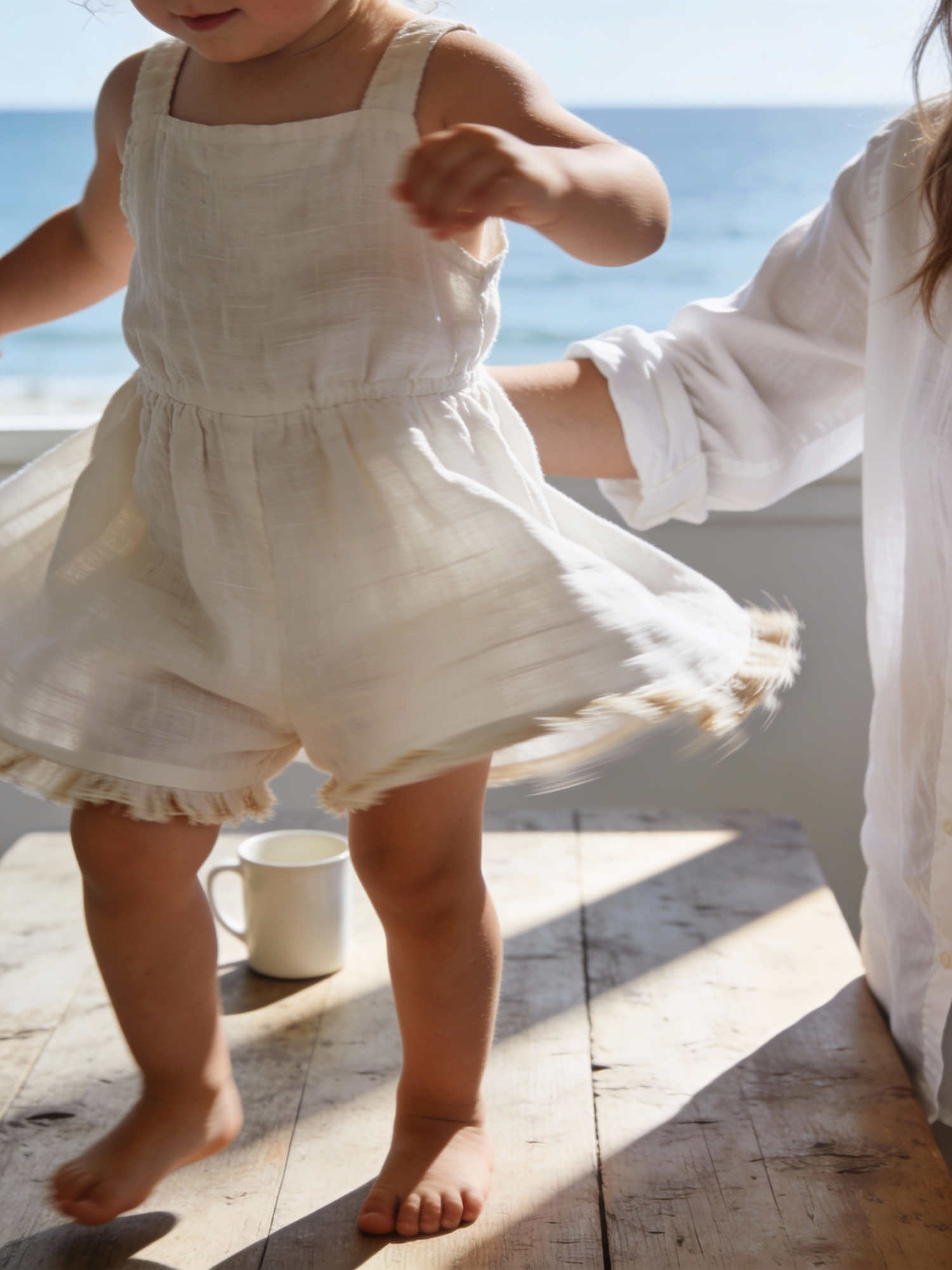 A professional interior photograph, 35mm look, close-up capturing the toddler’s off-white linen romper dress swaying as she twirls, fabric folds and weave sharp with slight motion blur at the edges. The woman’s off-white linen shirt sleeve enters frame lightly. Diagonal sunbeam across the rustic table surface in the background; off-white mug softly blurred. No faces shown. Bright crisp coastal morning light, high-end lifestyle photography, realistic color.