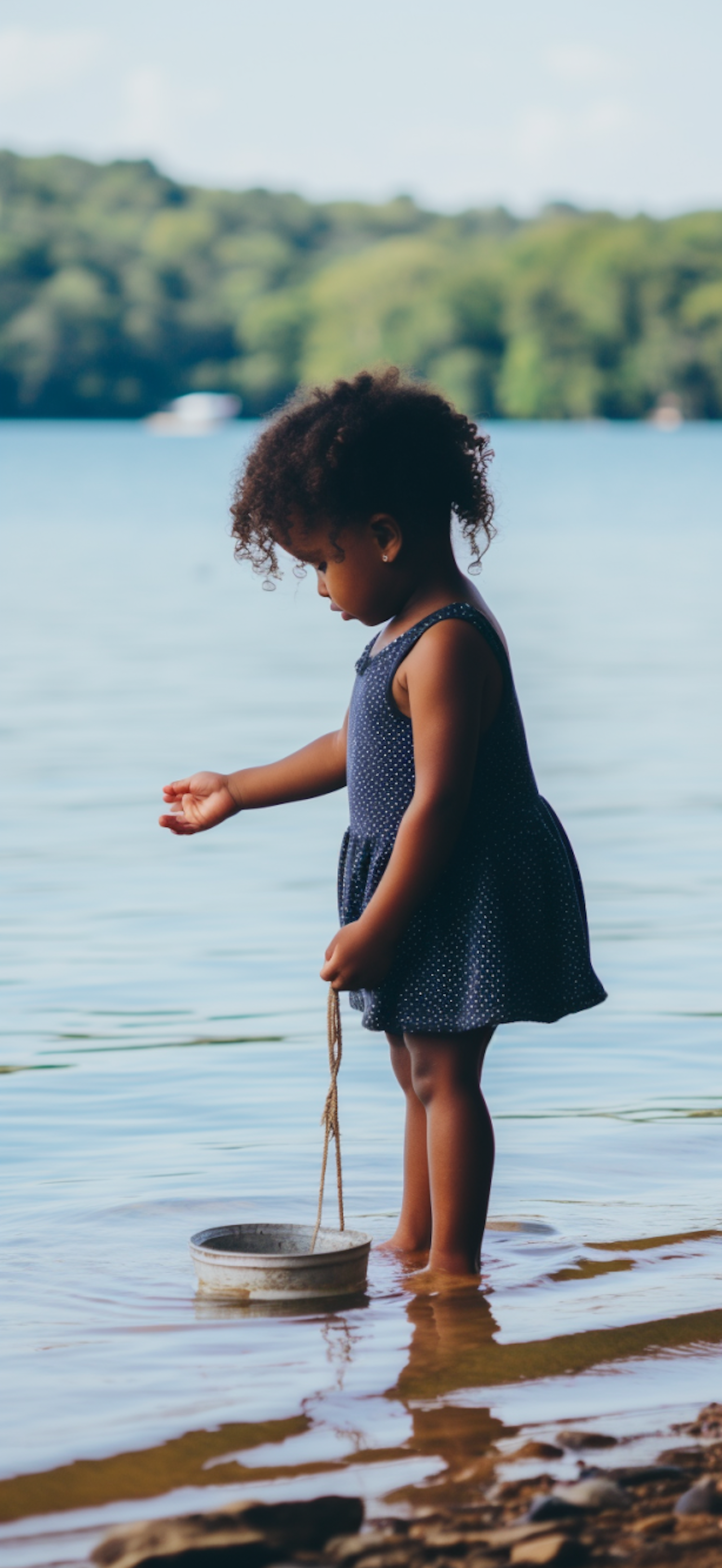 Young girl in a polka dot dress playing by a serene lake, holding a bucket. Tranquil scene with lush greenery in the background.