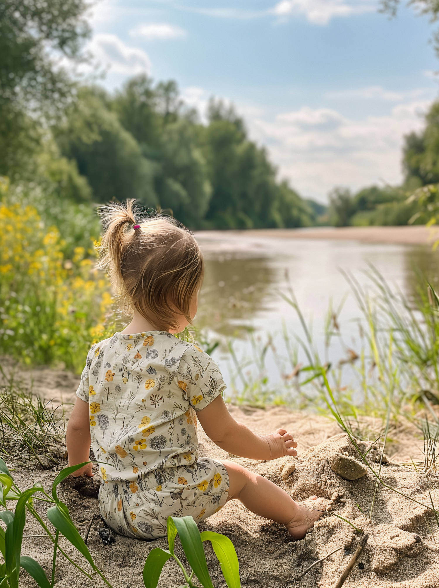 Child with ponytail playing on a sandy riverbank, surrounded by lush greenery and a calm river under a blue sky.