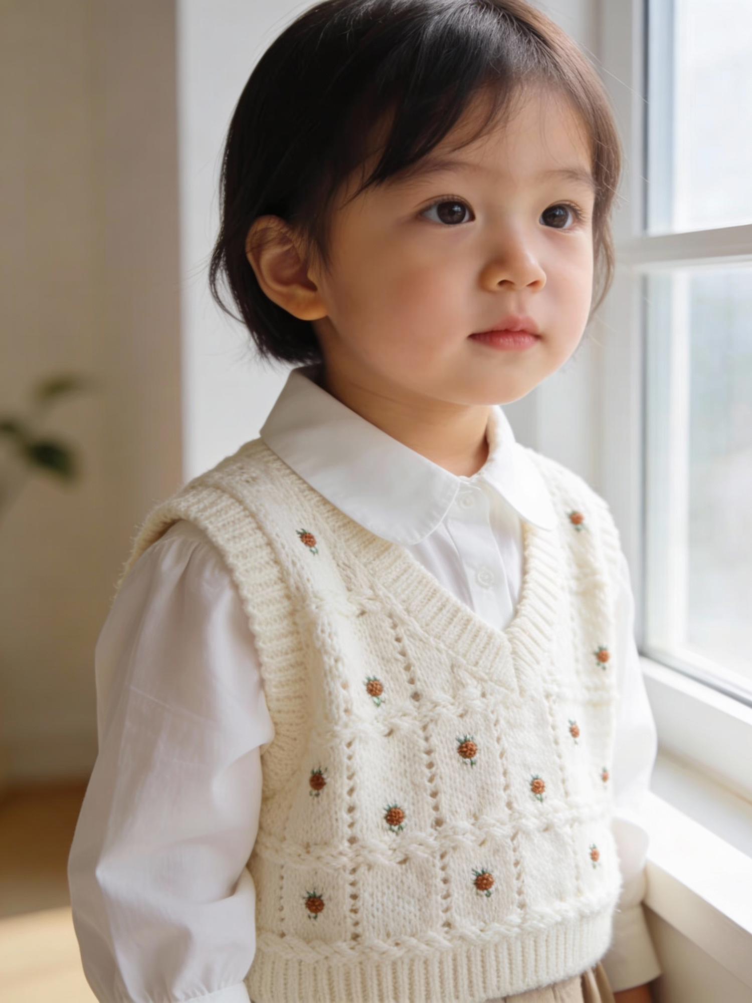 Fashionable toddler outfit photo, airy Scandinavian home interior. Waist-up close-up near a bright window, focusing on the cream crochet knit vest with small embroidered dots over a white collar blouse; child’s face softly in frame, looking slightly off-camera. Soft natural daylight, warm neutral walls, shallow depth of field, minimal plant blurred, realistic lifestyle kids editorial photography, high detail, clean composition, no text, no logos.