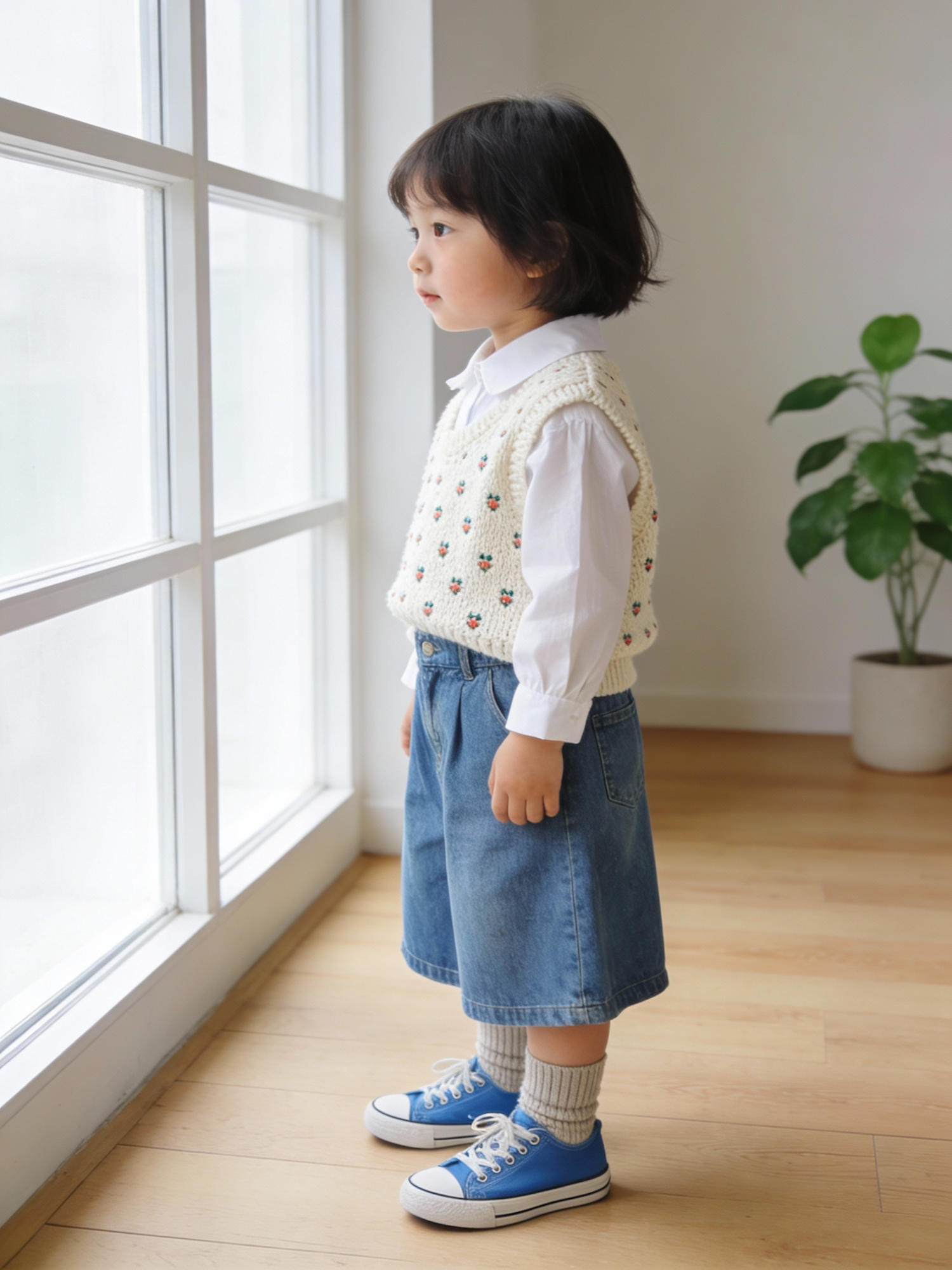 Fashionable toddler outfit photo, airy Scandinavian home interior. Child standing in profile near a bright window, wearing a cream crochet knit vest with small embroidered dots over a white collar blouse, high-waist denim culottes, ribbed socks, and blue canvas sneakers (no logos). Soft natural daylight, warm neutral walls, light wood floor, minimal plant in corner, lifestyle kids editorial photography, realistic, high detail, clean composition, no text.