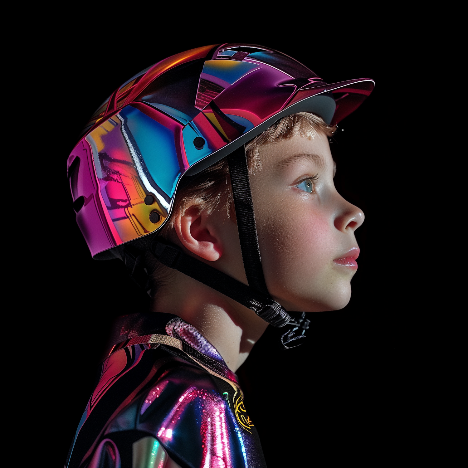 A young boy in a colorful, futuristic helmet gazes sideways against a black background, highlighting vibrant reflections.