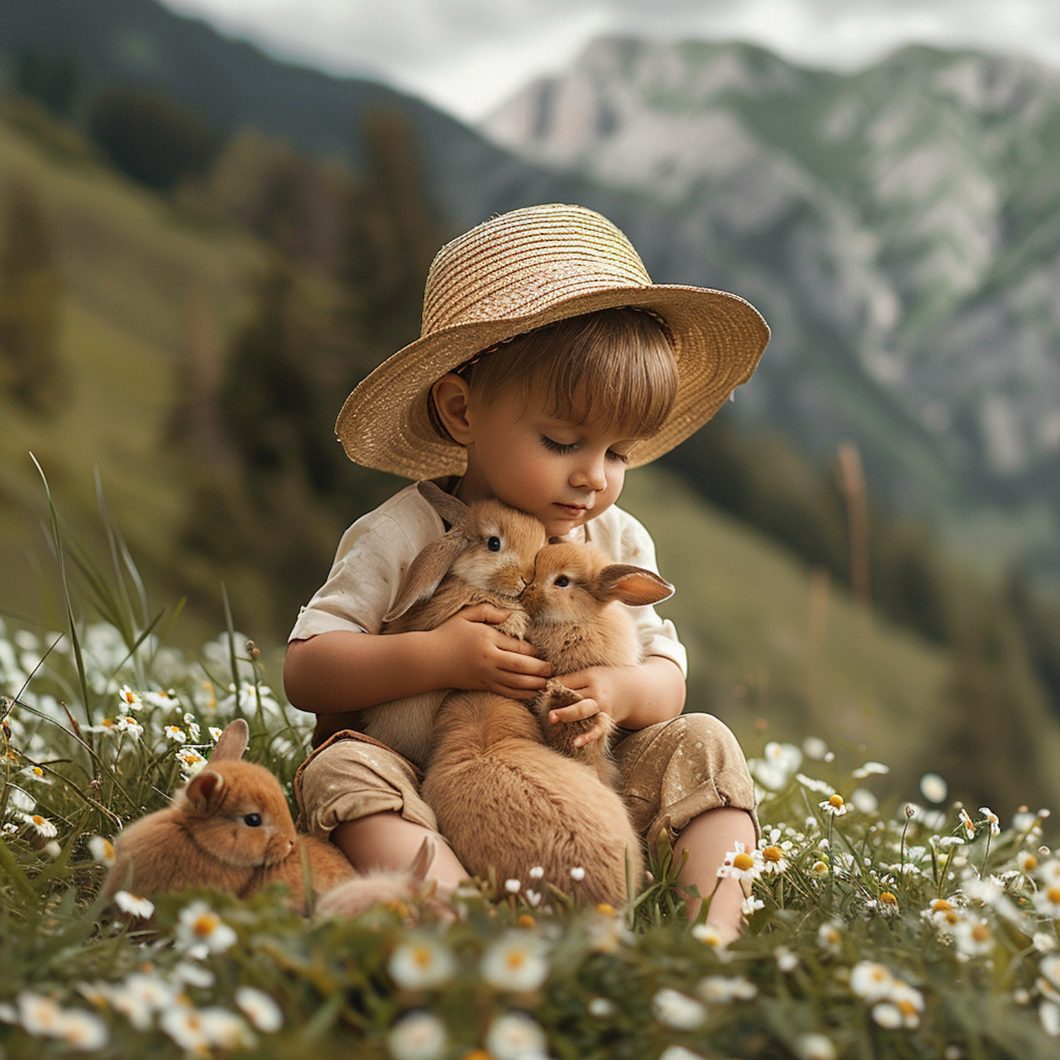 A child in a straw hat cuddles rabbits in a daisy-filled meadow, with mountains in the background, creating a serene and joyful scene.
