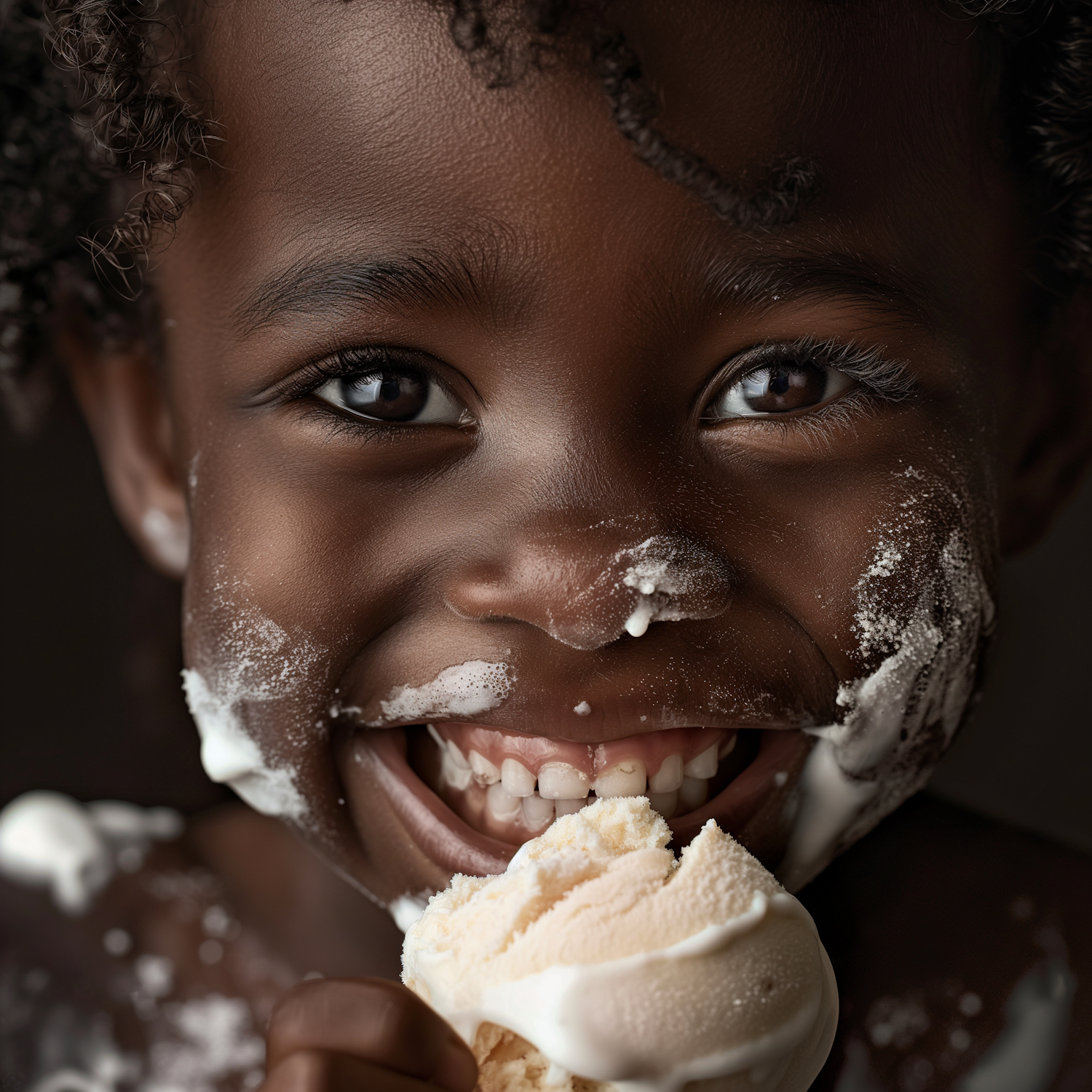 Close-up of a smiling child with ice cream on their face, holding a cone of vanilla ice cream, radiating joy and playfulness.