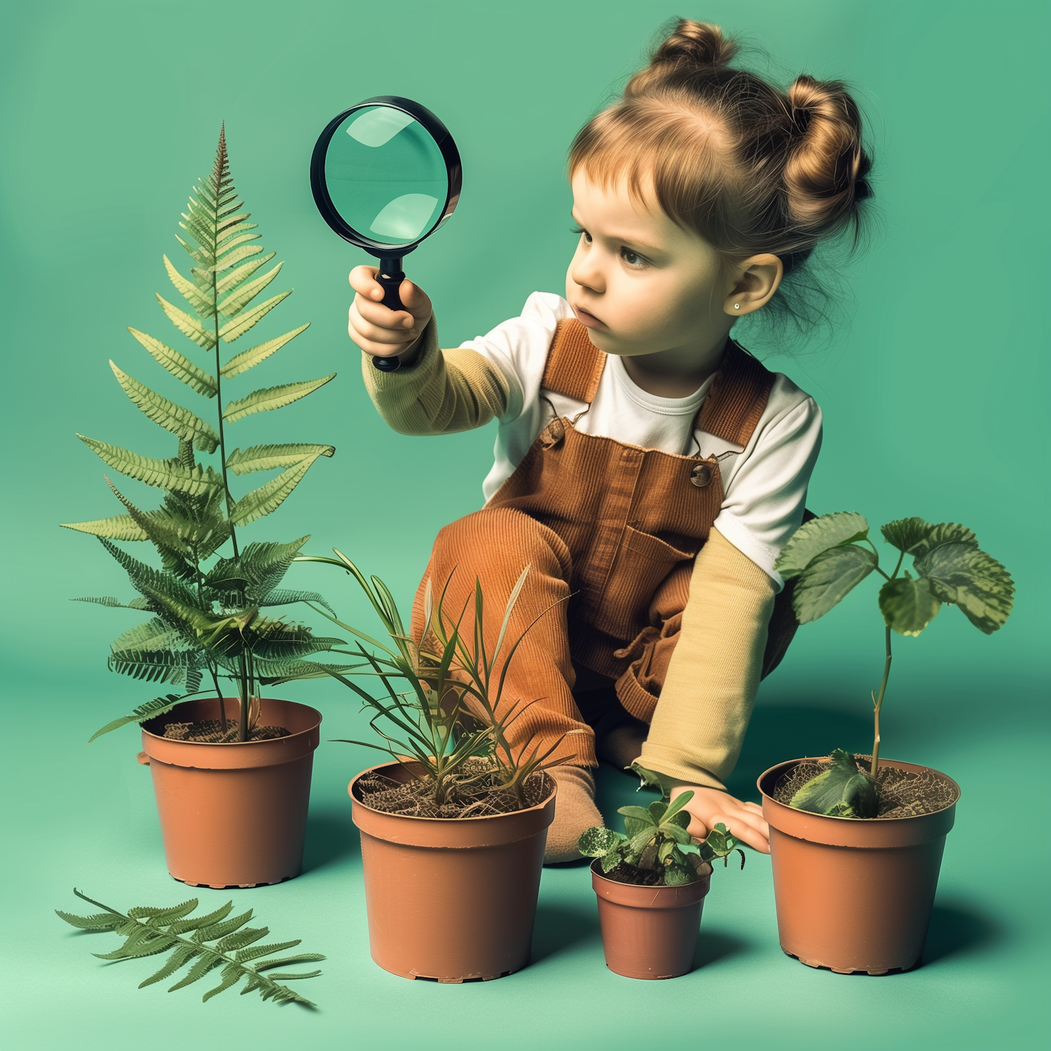 Curious child with magnifying glass explores potted plants, highlighting a playful and educational nature scene.