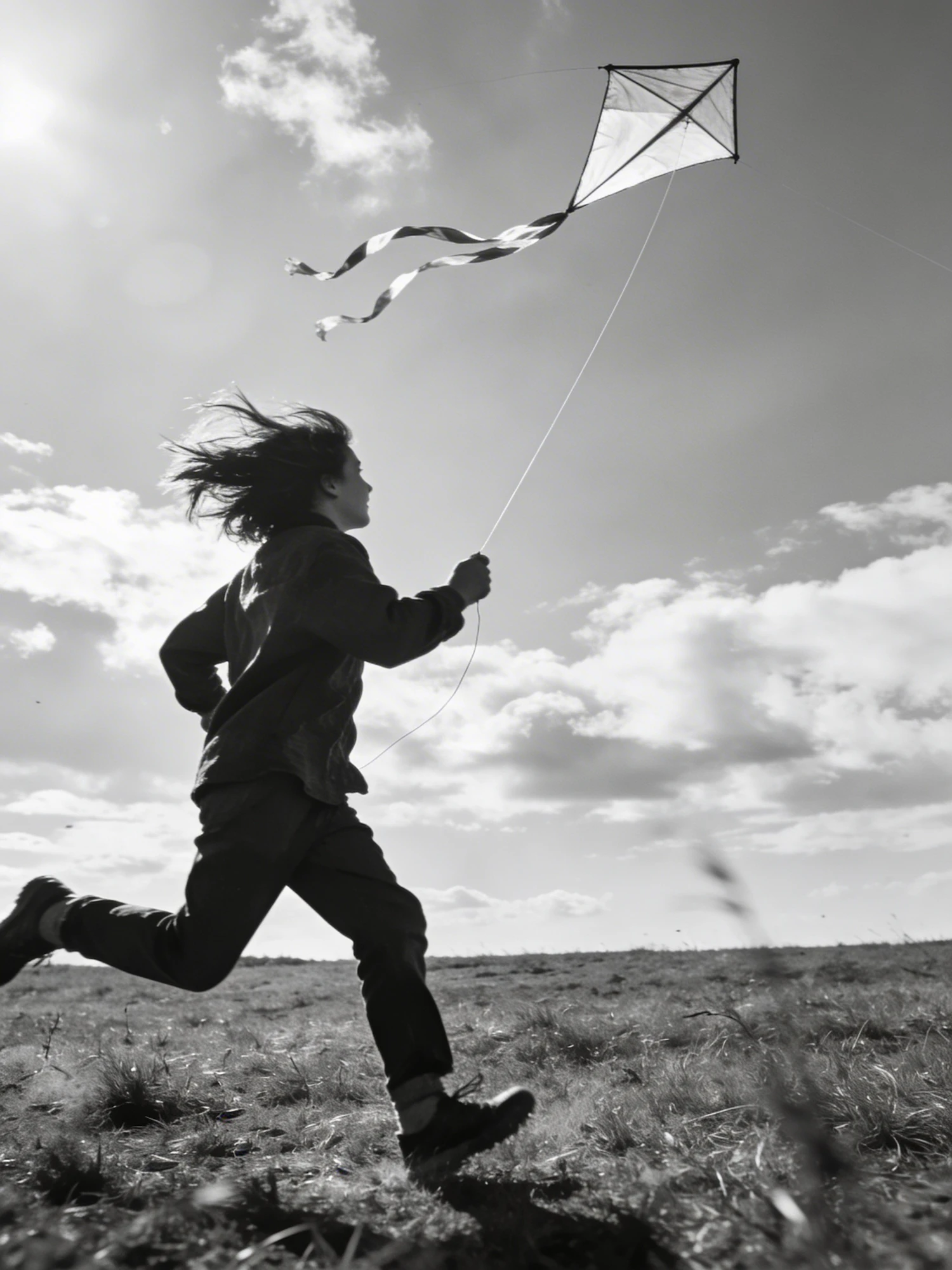 A child runs across a field flying a kite in a black-and-white photo, capturing a moment of joy and freedom under a cloudy sky.