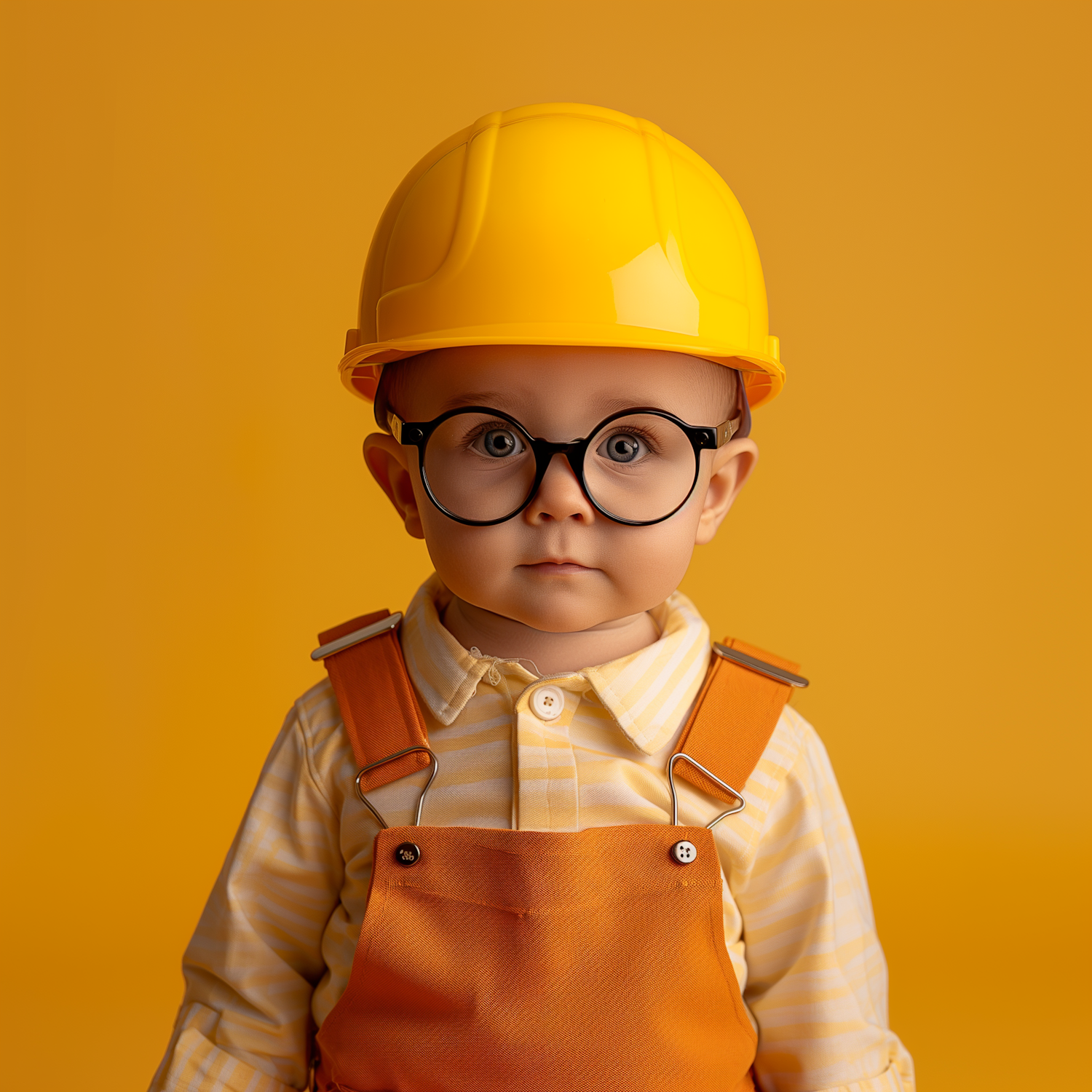 Adorable child in a yellow hard hat and glasses, wearing orange overalls against a matching yellow background.