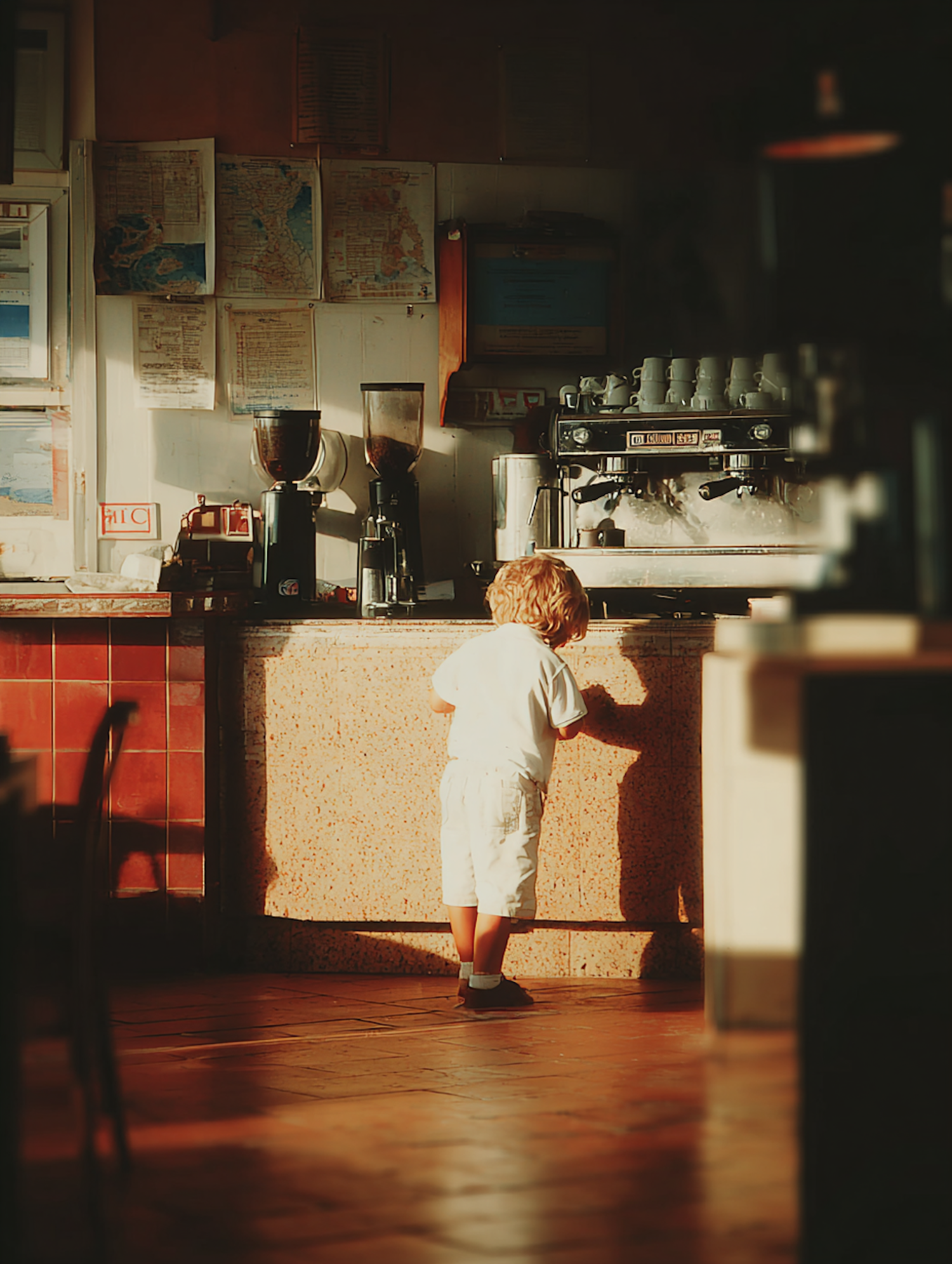 A child in a white outfit stands at a café counter, bathed in warm sunlight, with a coffee machine and maps in the background.