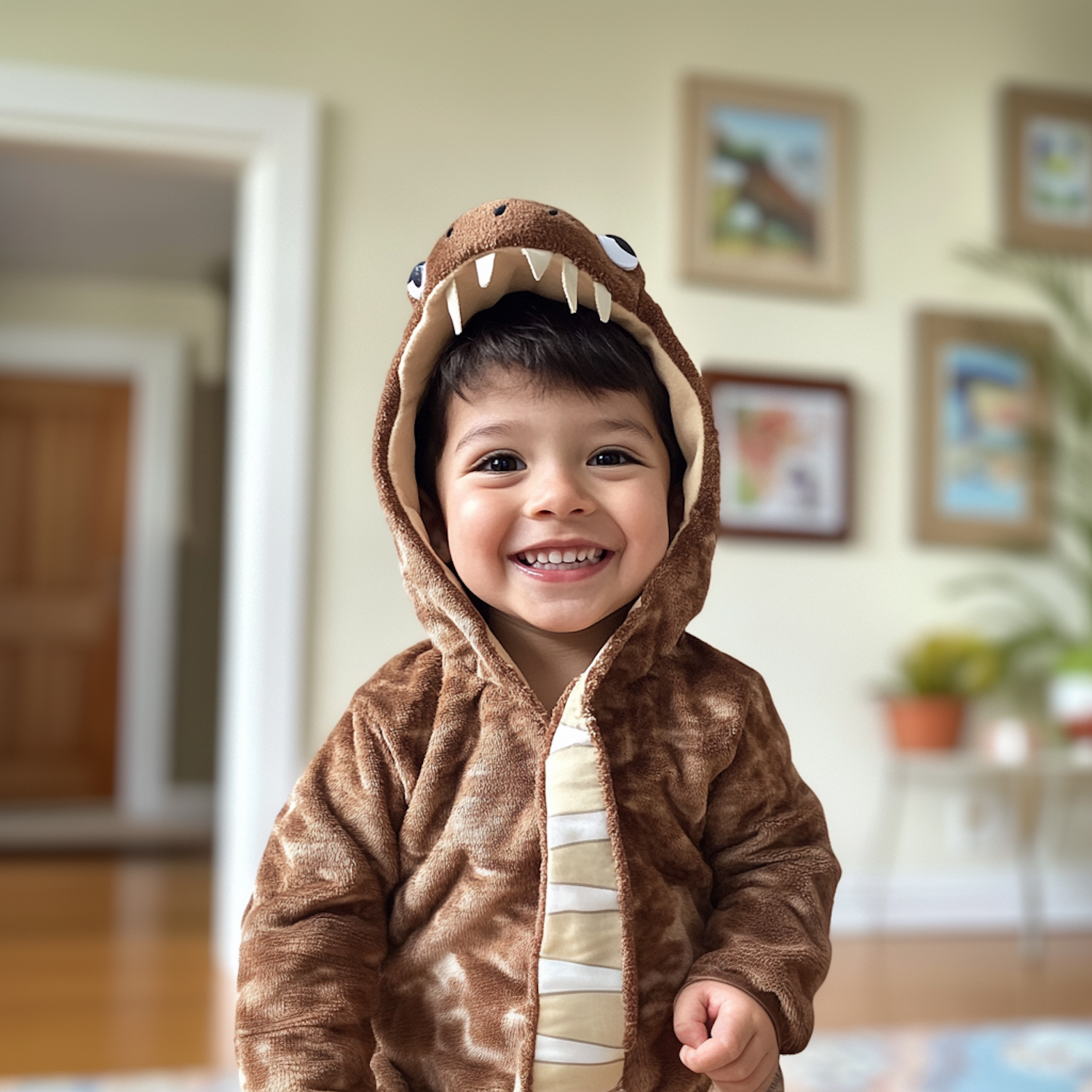 Adorable child in a dinosaur costume, smiling brightly in a cozy room with framed art and a plant in the background.