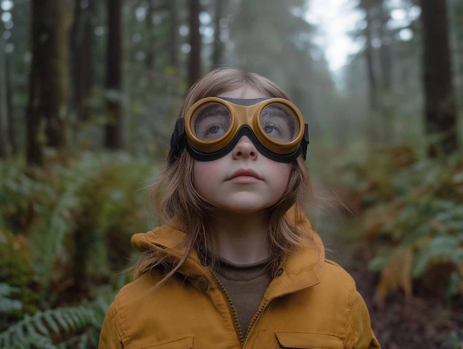 Child in yellow goggles and jacket gazes upward in a lush forest, surrounded by tall trees and dense greenery. Dreamy and adventurous vibe.