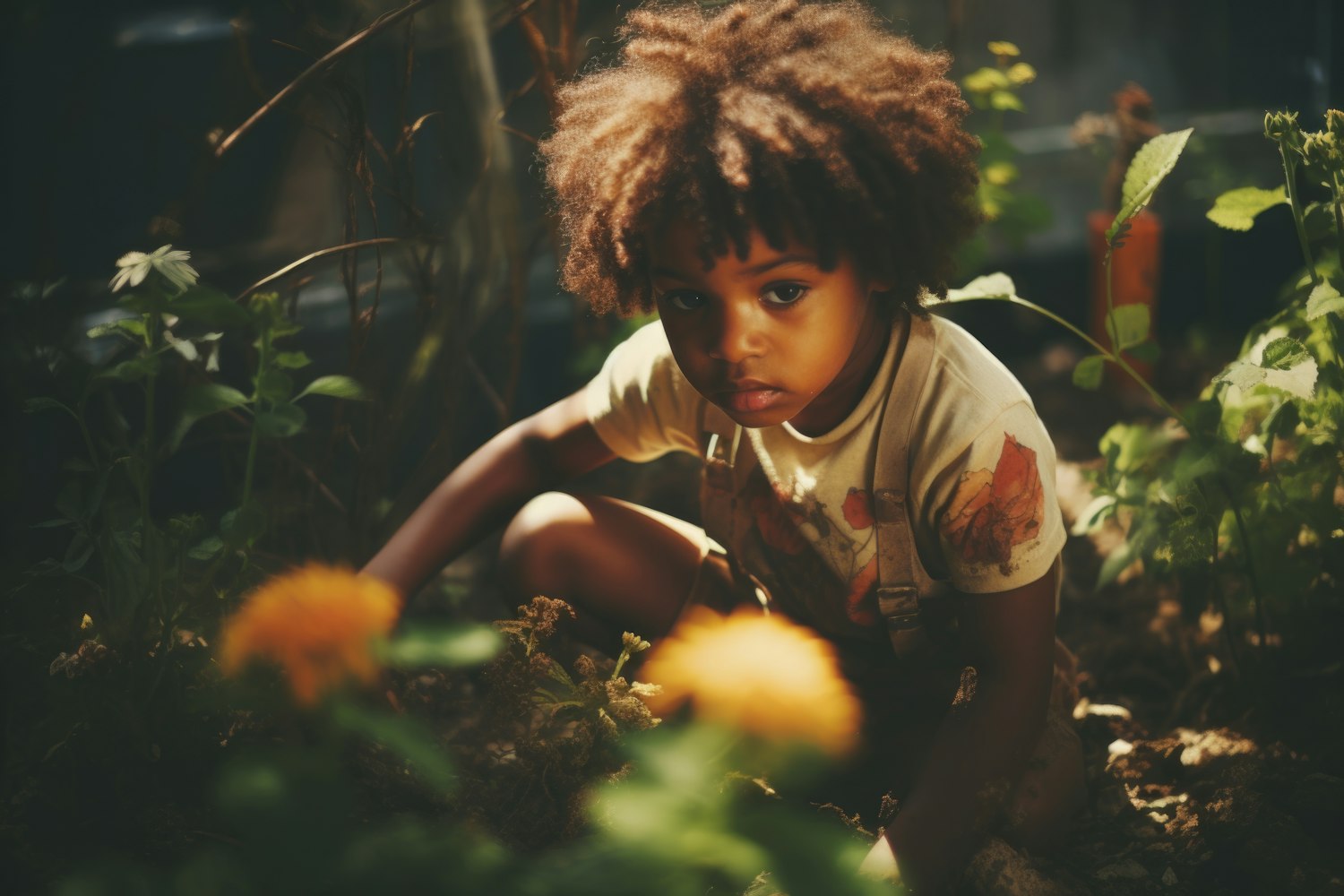 Curious child with curly hair explores a lush garden, surrounded by vibrant flowers and sunlight filtering through leaves.