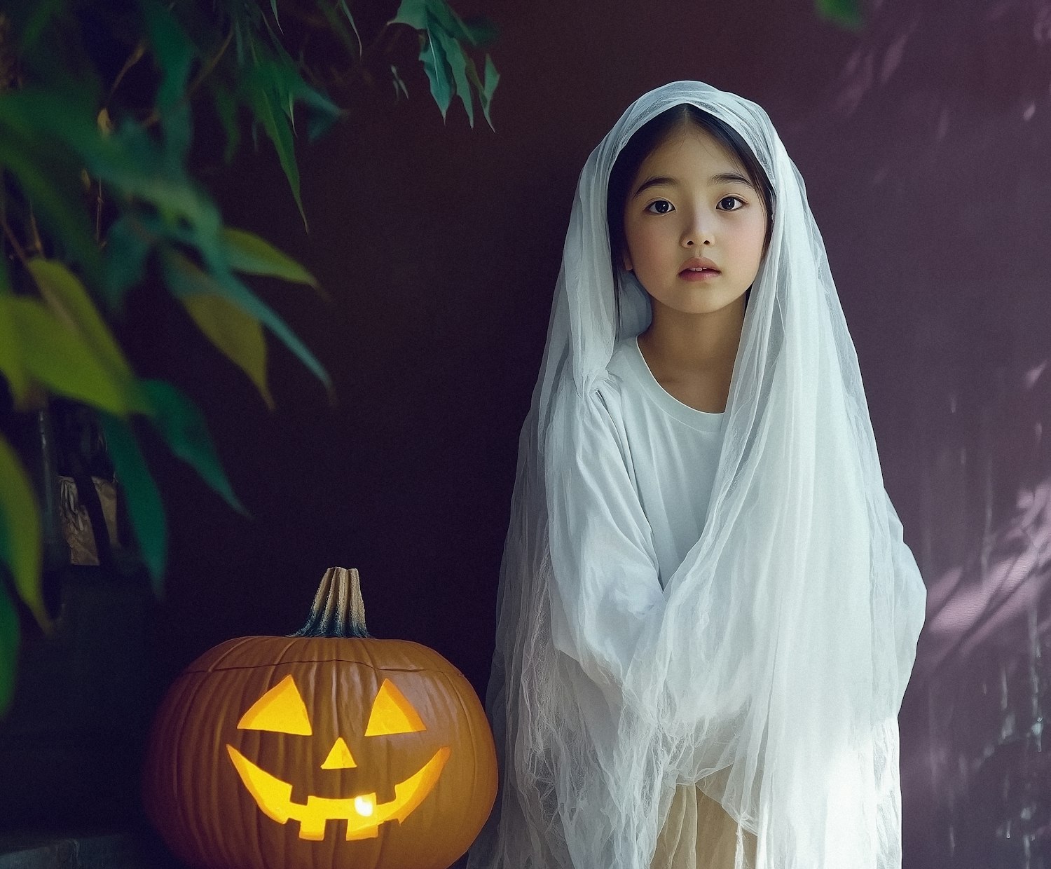 Young girl in a ghost costume with a glowing jack-o'-lantern, creating a serene Halloween scene.