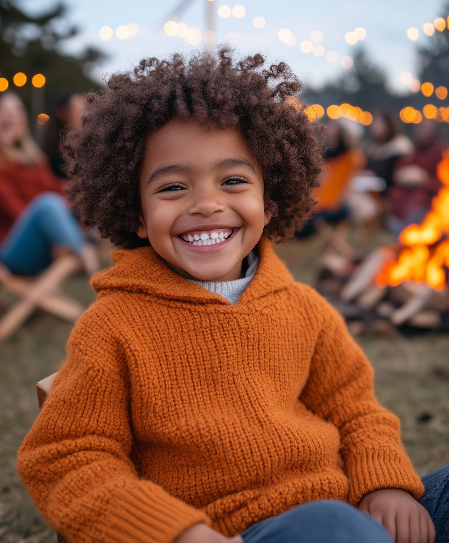 Child in orange sweater at outdoor gathering with string lights and campfire, creating a warm, festive atmosphere.