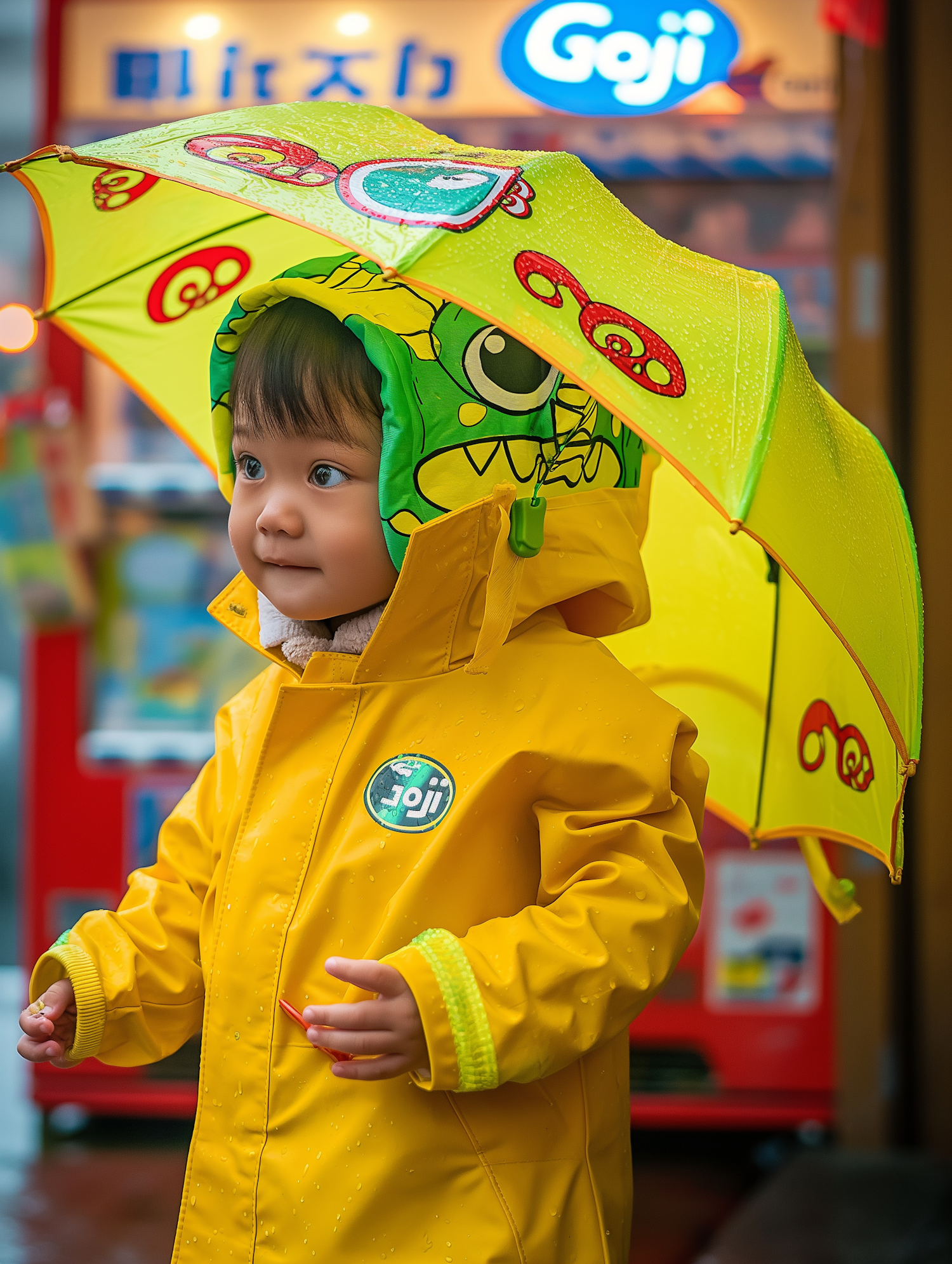 Adorable child in yellow raincoat and umbrella with cartoon designs, standing in front of a colorful vending machine.