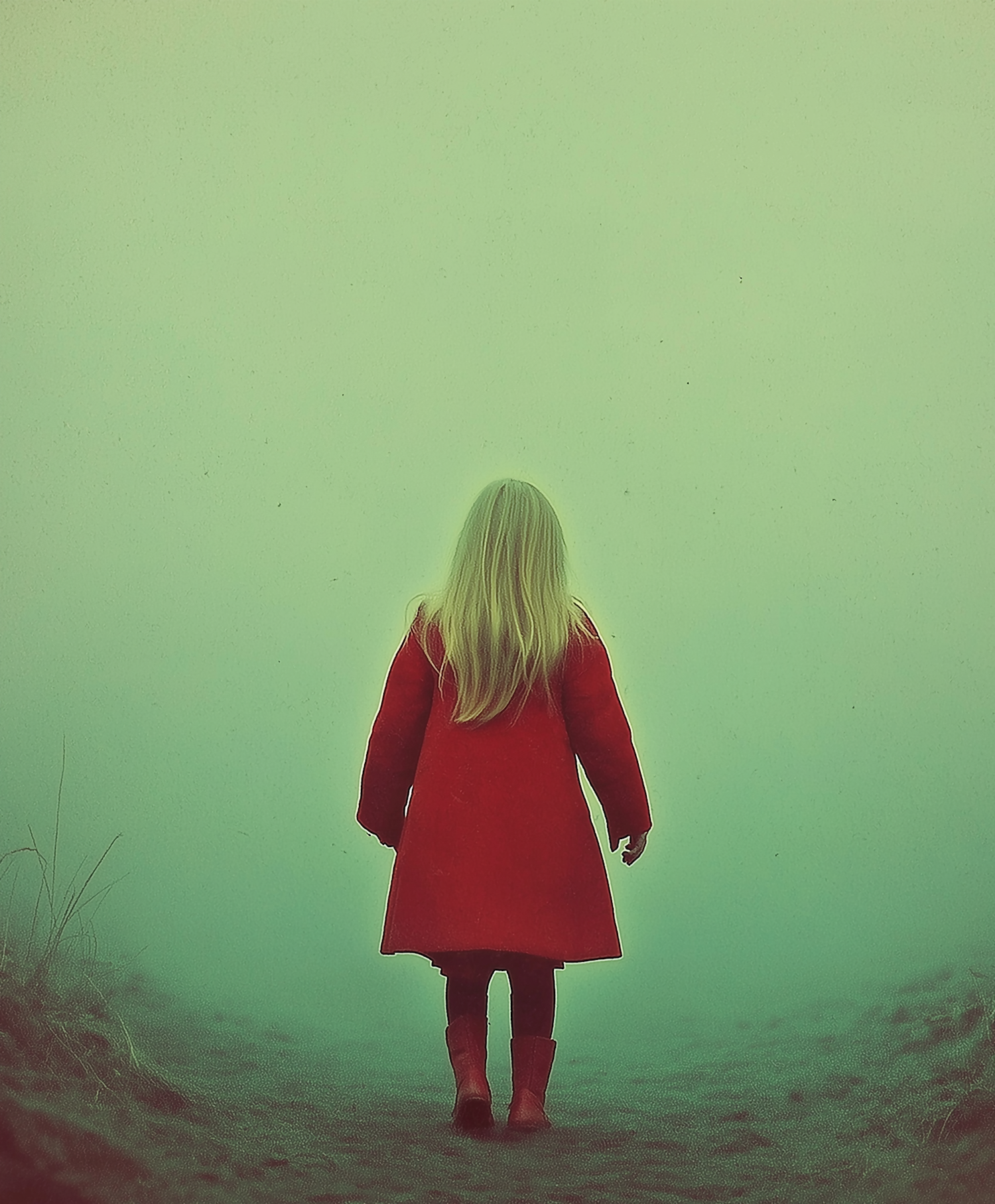 A young girl in a red coat walks into a foggy, green-tinted landscape, creating a mysterious and ethereal atmosphere.