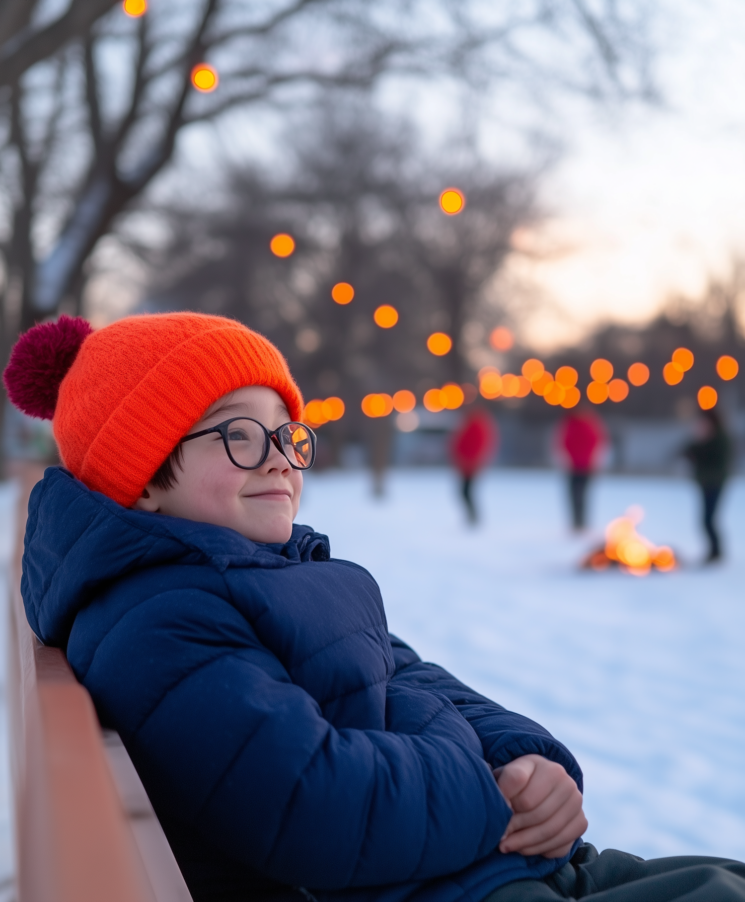 Young boy in orange beanie and glasses enjoys a snowy winter scene with festive lights and a bonfire in the background.