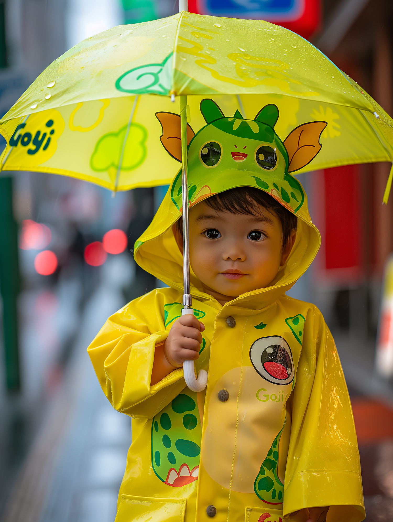 Adorable child in a yellow raincoat and umbrella with cartoon designs, standing on a rainy city street. Bright and cheerful scene.