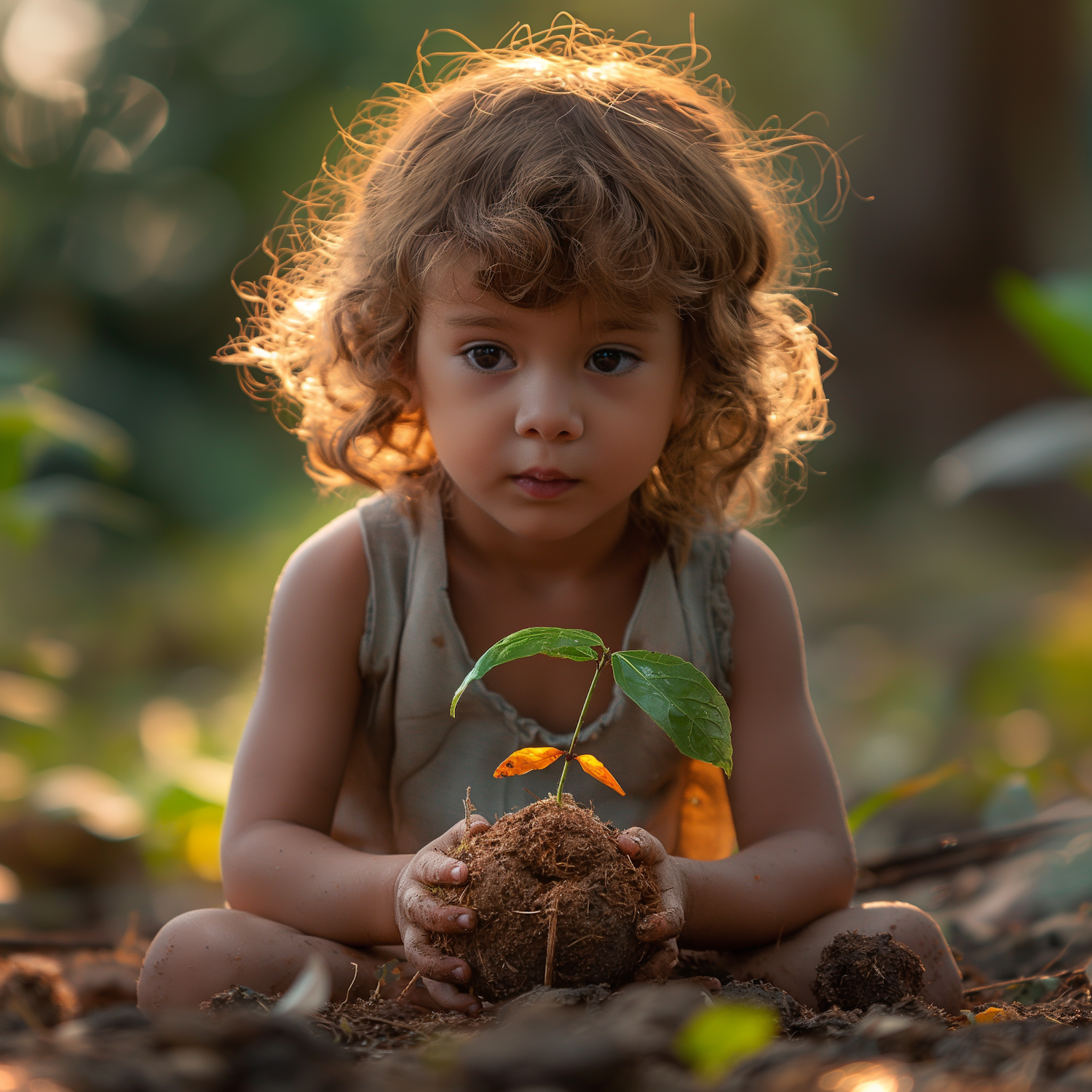 A young child with curly hair holds a small plant in soil, surrounded by warm sunlight and greenery, symbolizing growth and nature.