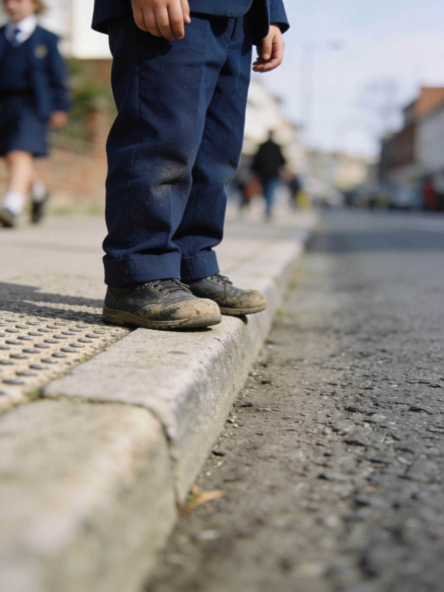A child in a navy school uniform stands on a curb, with scuffed shoes and a blurred street scene in the background.