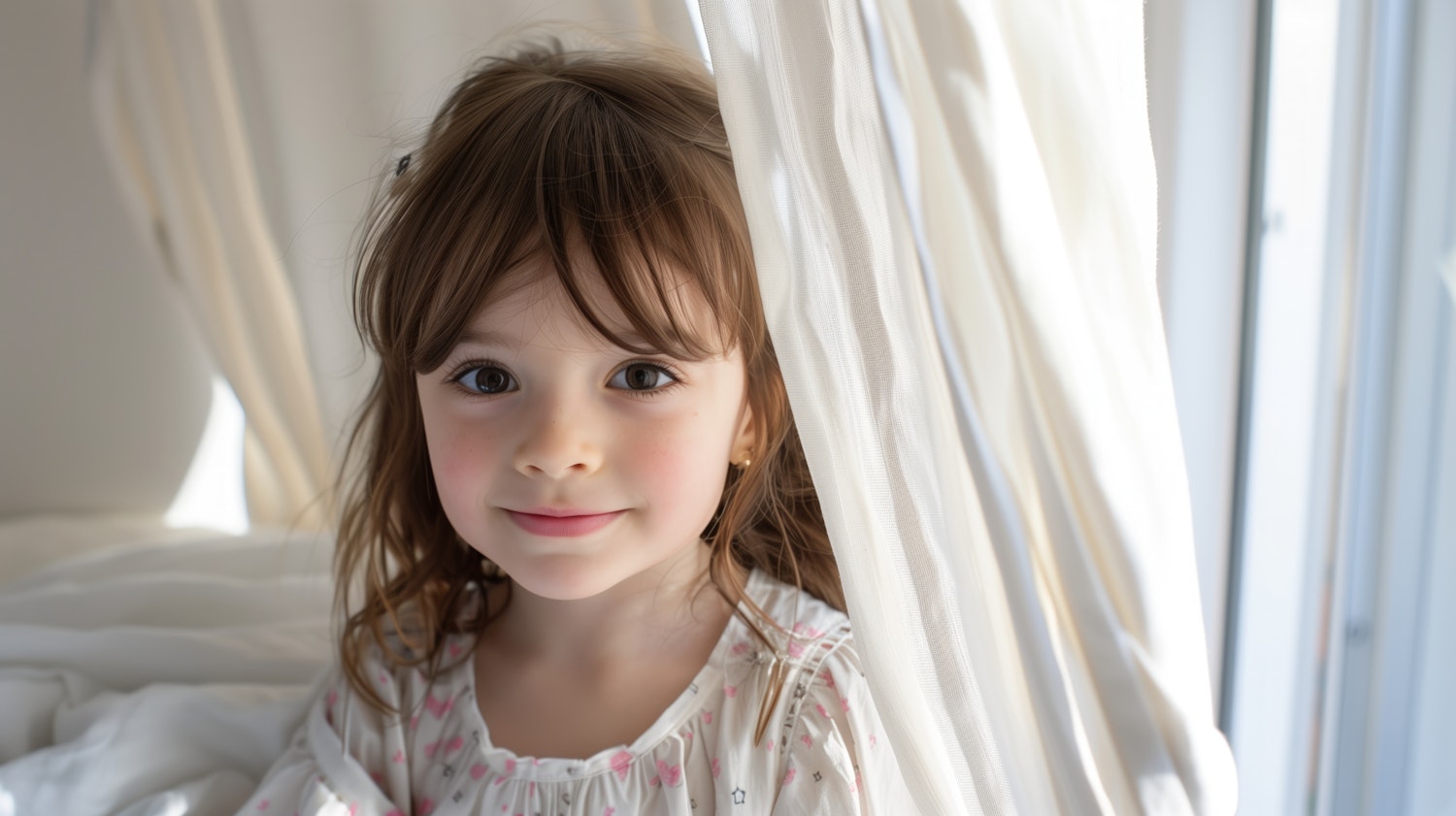 Young girl with brown hair and expressive eyes, framed by soft white curtains in gentle natural light.