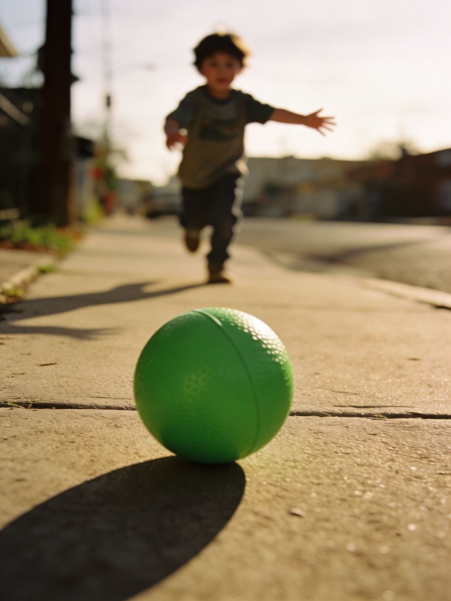 Ultra-documentary street photography, warm afternoon light, candid childhood moment, muted surroundings with bright green as dominant accent, gentle grain, shallow depth of field, 35mm lens look. A green rubber ball rolling across the sidewalk while a child reaches toward it, spontaneous movement frozen naturally.
