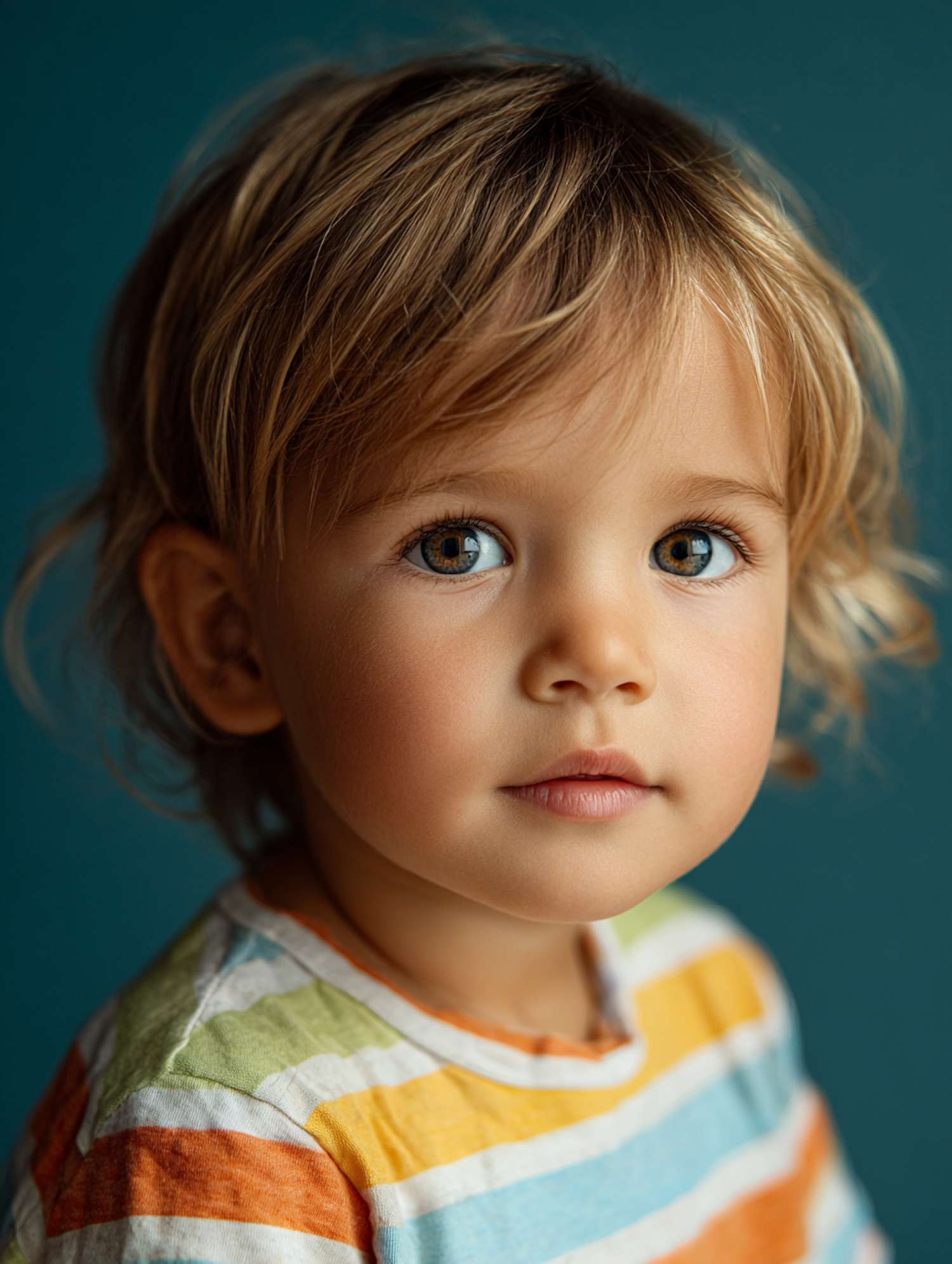 A young child with light brown hair and a colorful striped shirt gazes softly against a teal background, creating a serene portrait.