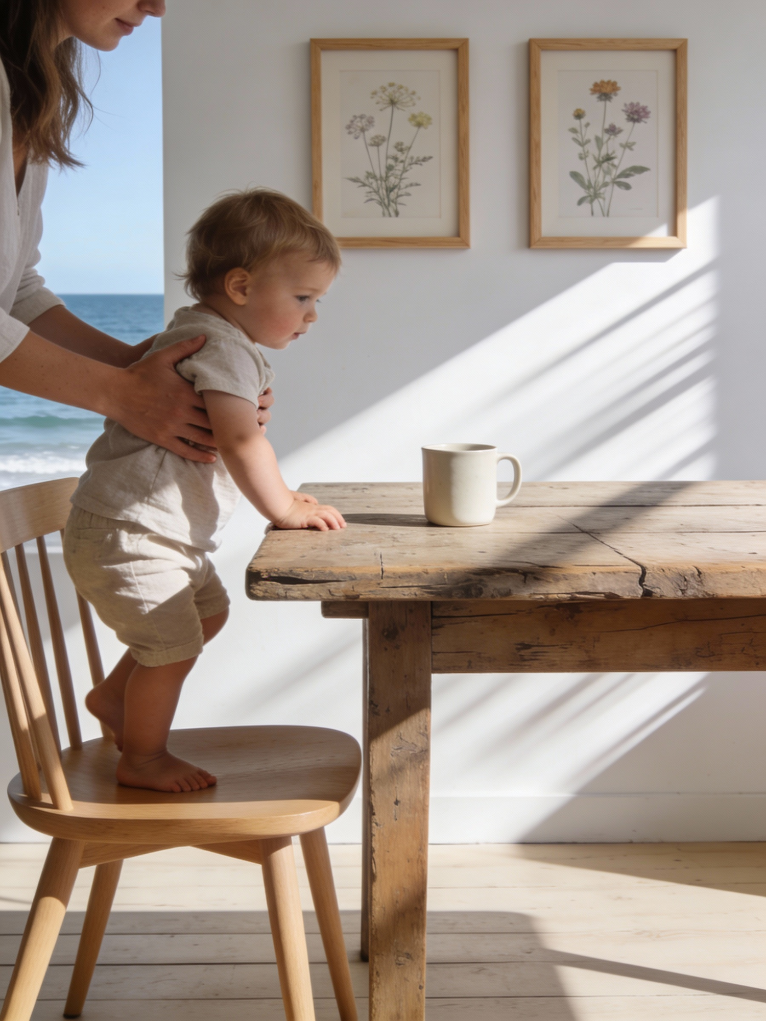 A toddler stands on a chair, supported by an adult, reaching for a mug on a rustic table in a sunlit room with ocean views.