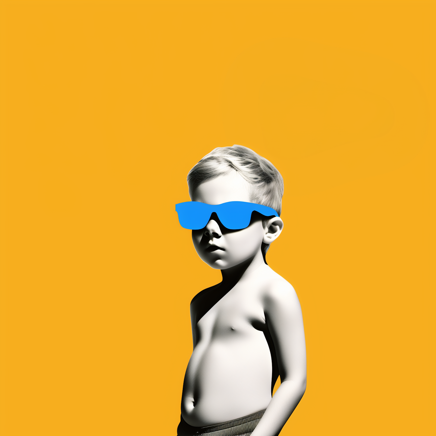 Stylish young boy with blue sunglasses against a vibrant orange background, blending monochrome and bold colors.