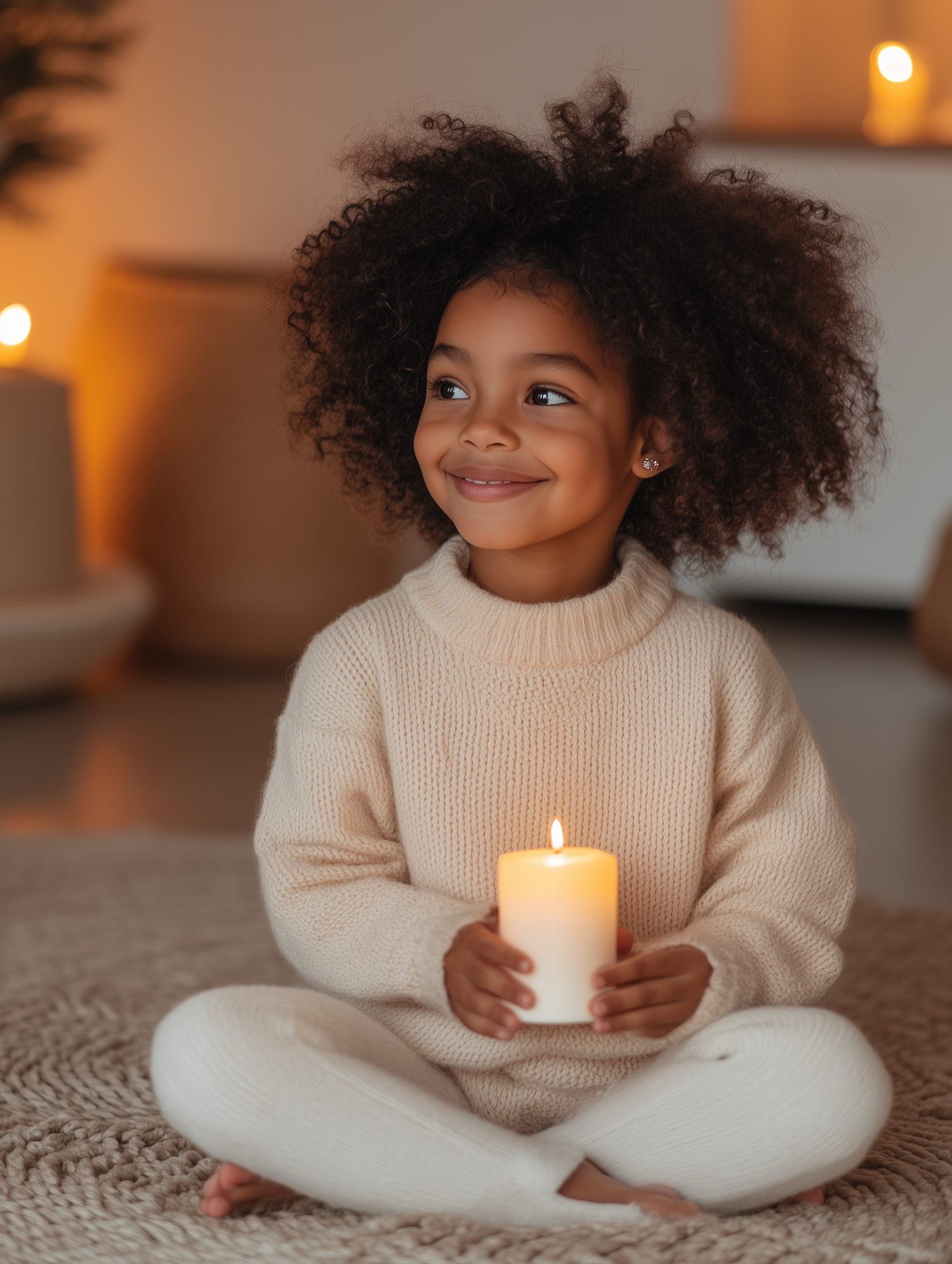 A young girl with curly hair holds a candle, sitting on a cozy rug in warm lighting, wearing a cream knit sweater and pants.