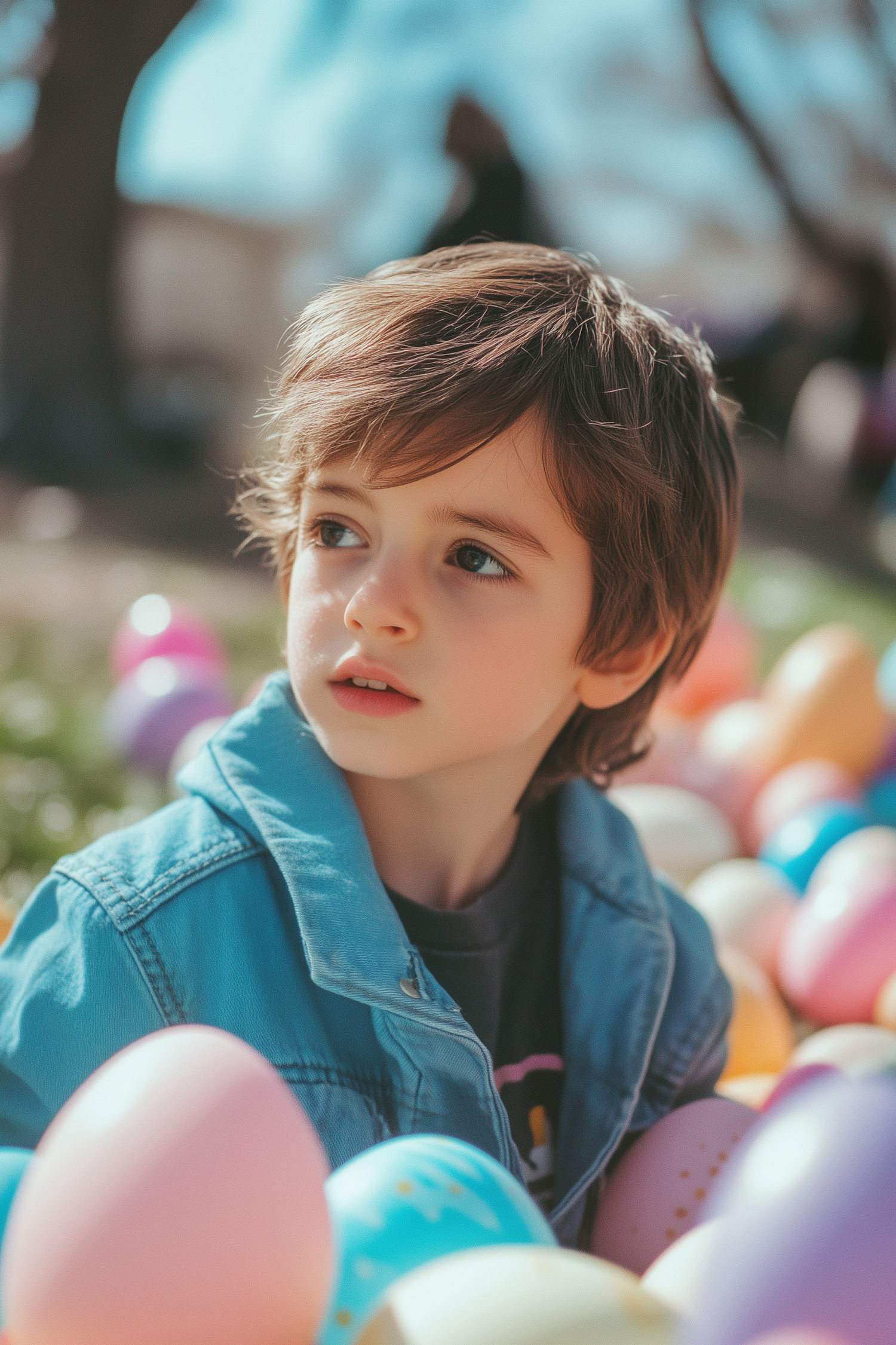 Young boy in a denim jacket surrounded by colorful Easter eggs, gazing thoughtfully outdoors.