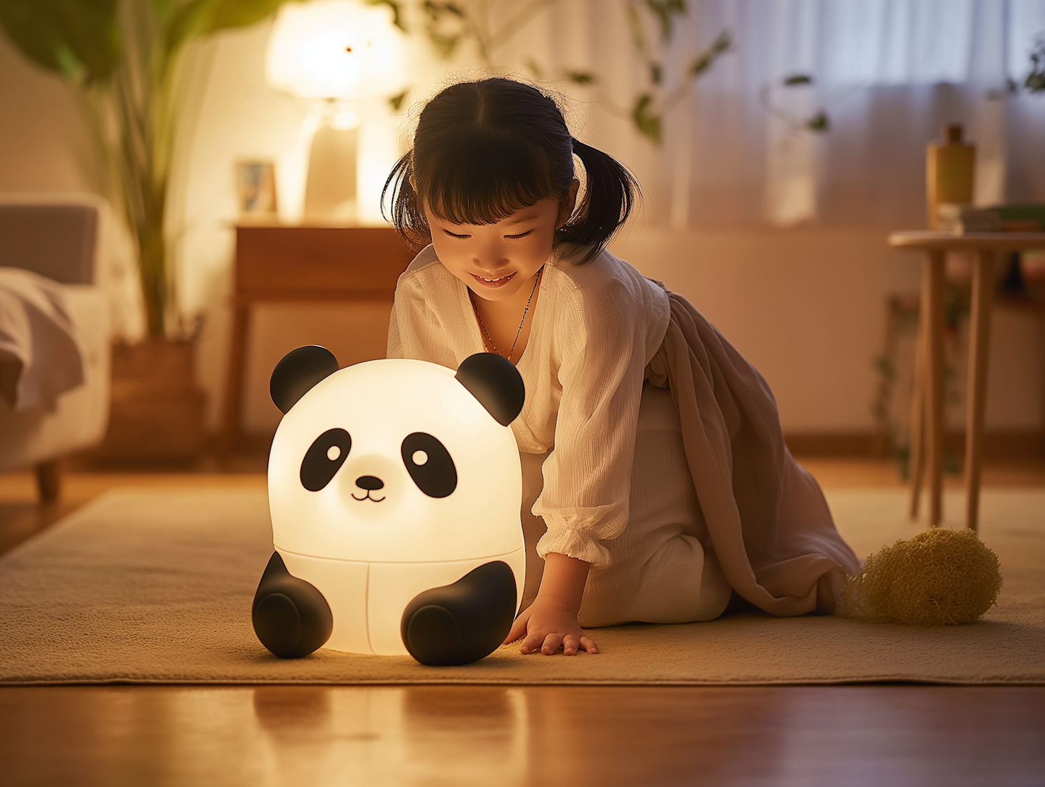 A young girl in a cozy room smiles at a glowing panda lamp, creating a warm and inviting atmosphere.