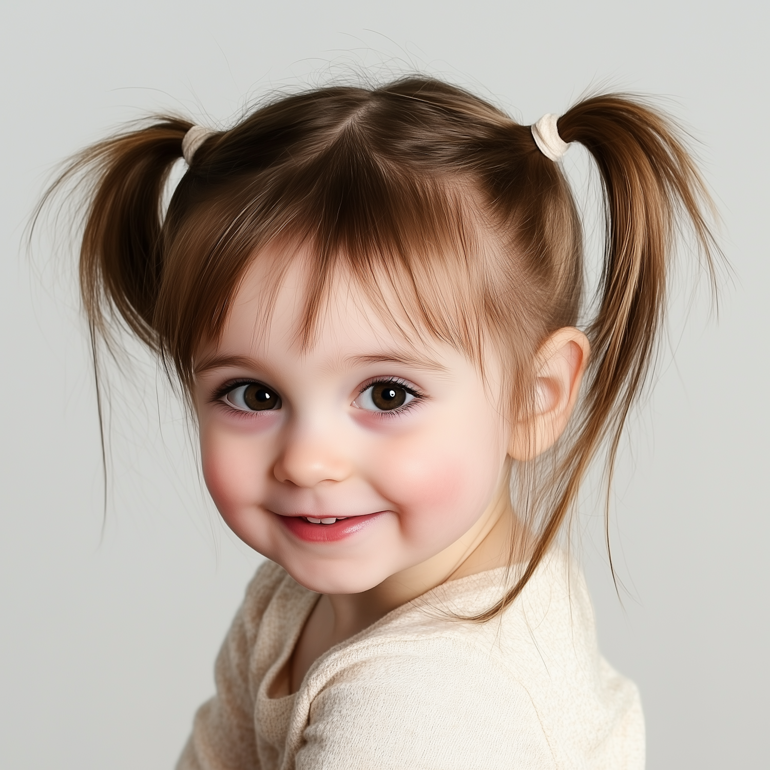 Adorable young girl with pigtails and a warm smile, wearing a cream top against a neutral background.