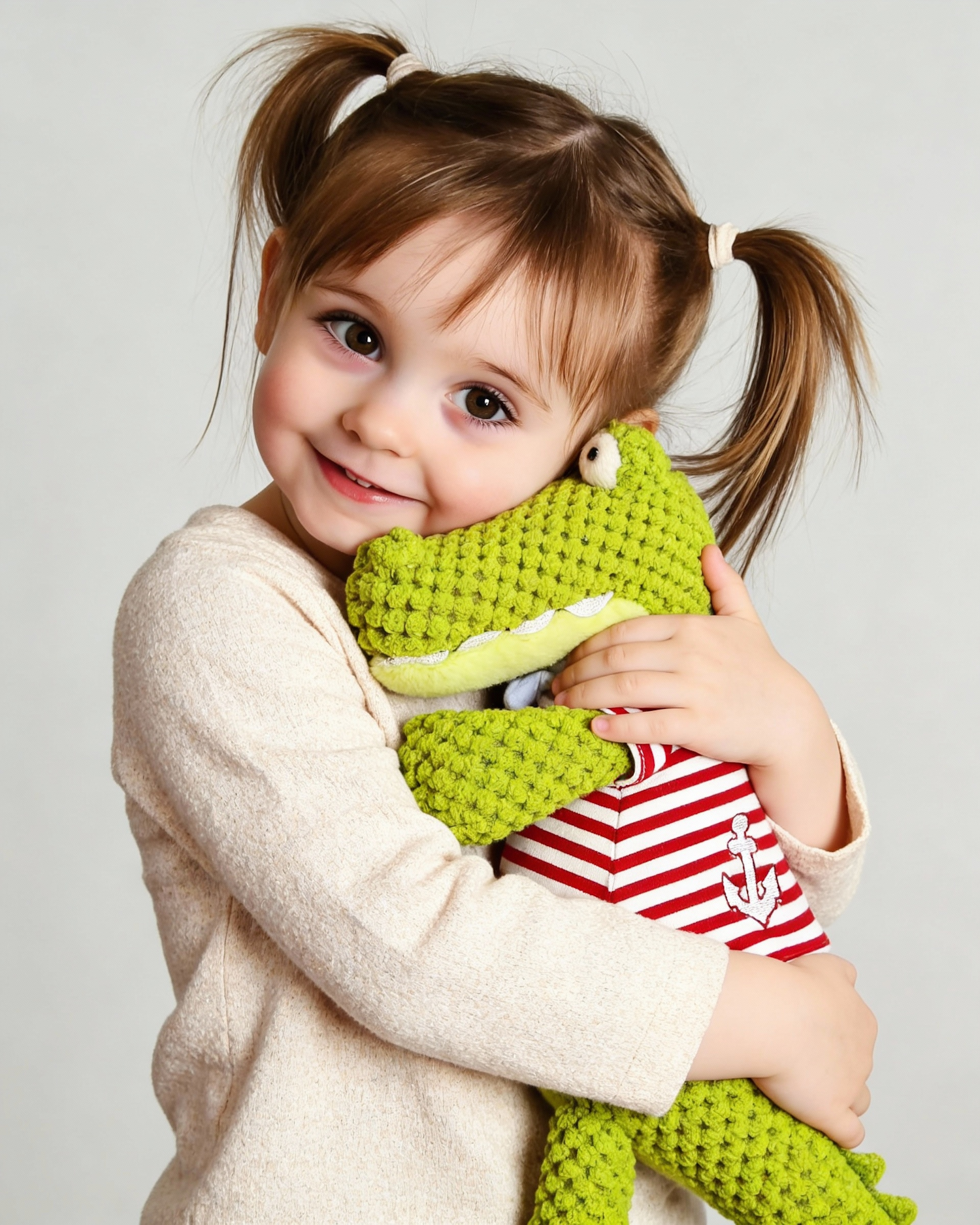 A smiling child with pigtails hugs a green crocodile plush toy in a striped shirt, set against a simple light background.