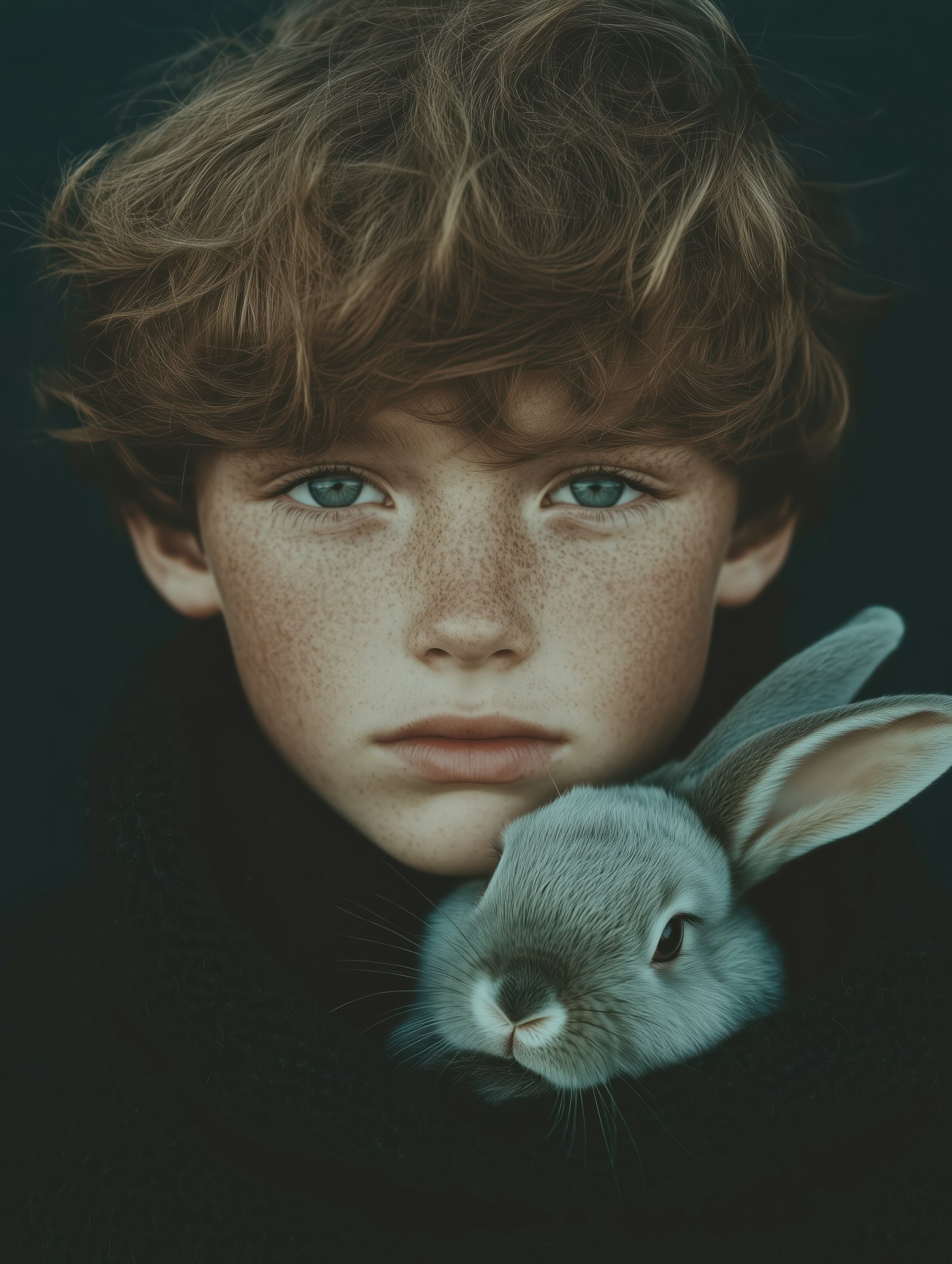 A freckled child with blue eyes and wavy brown hair holds a gray rabbit close, creating a serene and intimate portrait.