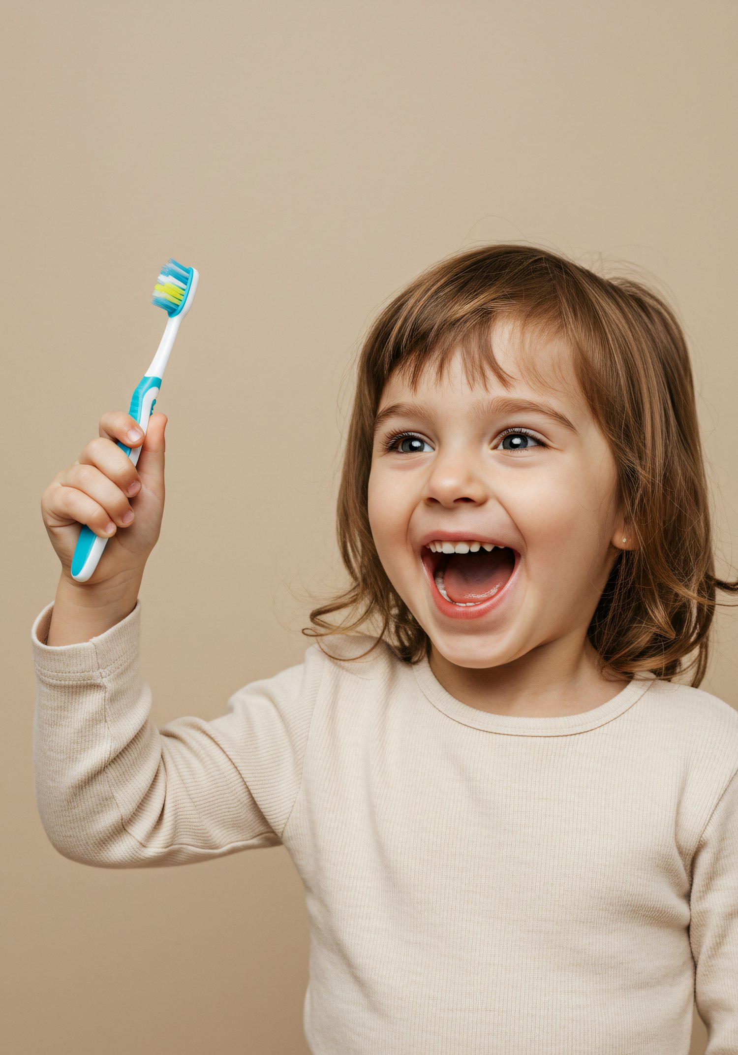 A cheerful child holding a colorful toothbrush, smiling brightly against a neutral background, showcasing joy and enthusiasm.