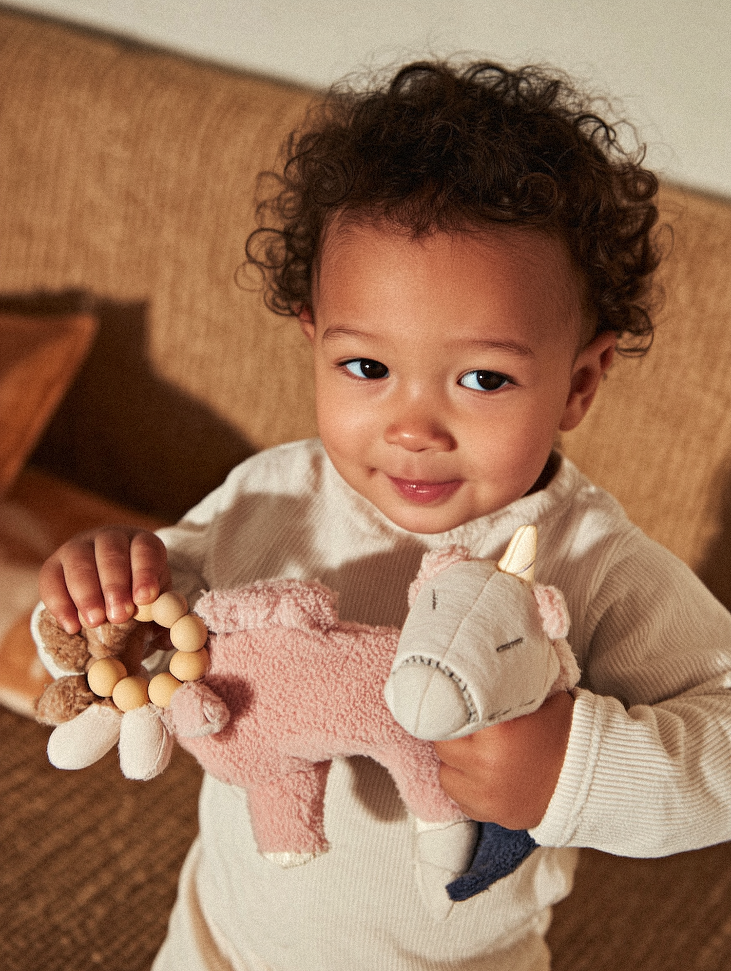 Adorable child holding a pink plush unicorn and a teething ring, smiling warmly in a cozy setting with a textured couch in the background.