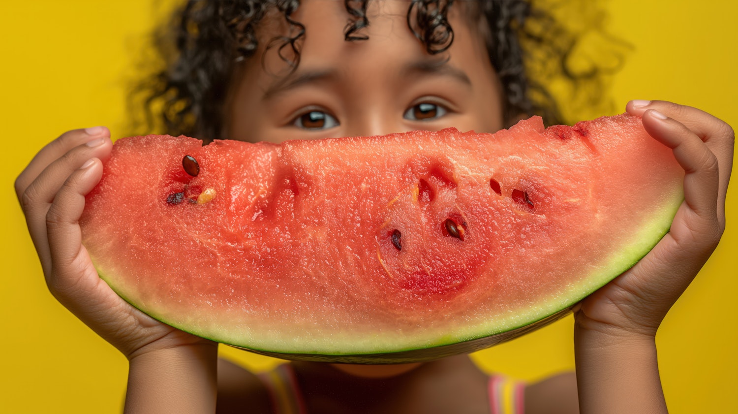 Child holding a juicy watermelon slice against a bright yellow background, creating a playful and vibrant summer vibe.