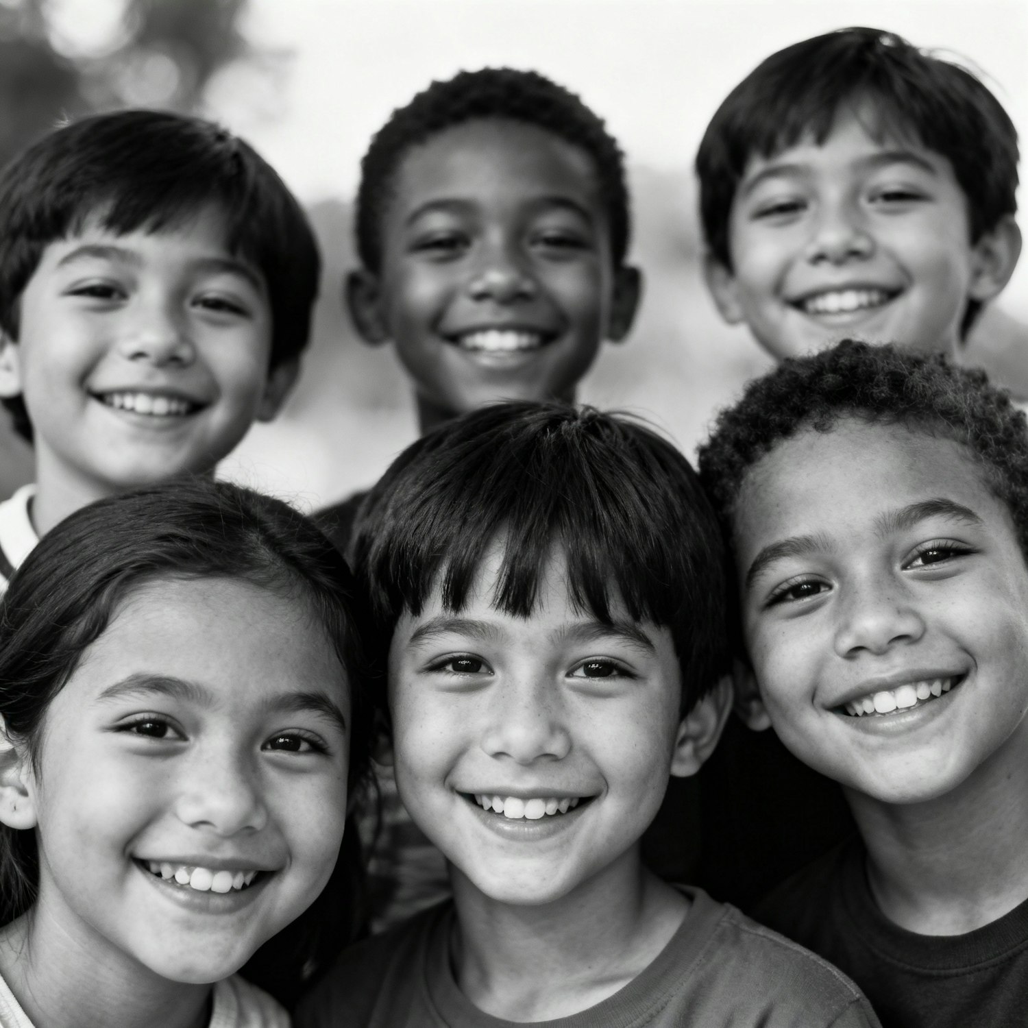 A black-and-white photo of six smiling children of diverse backgrounds, radiating joy and unity, with a softly blurred background.
