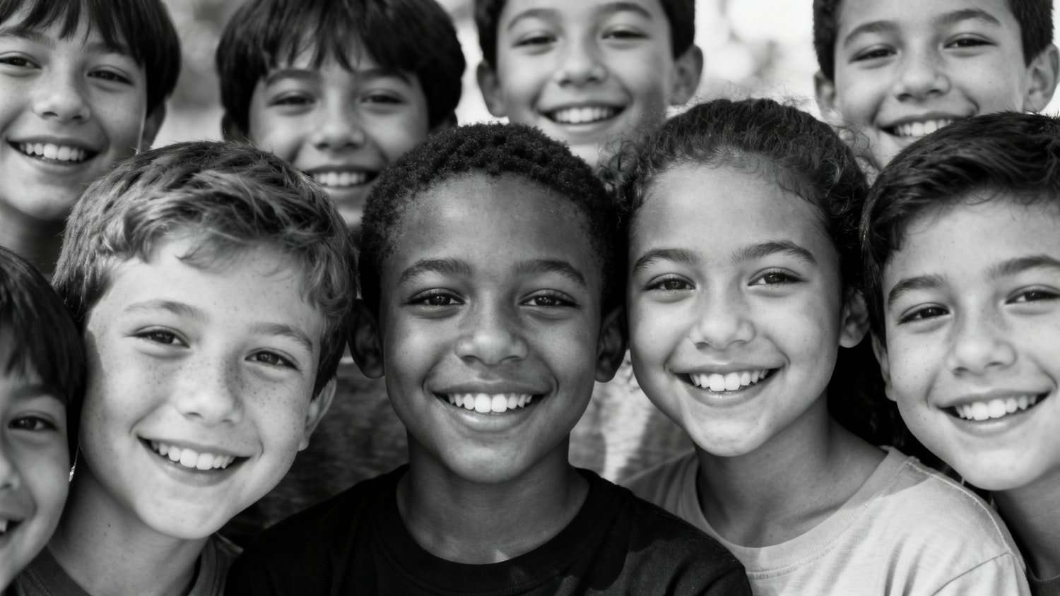 A black-and-white photo of a diverse group of smiling children, showcasing unity and joy with a focus on their cheerful expressions.