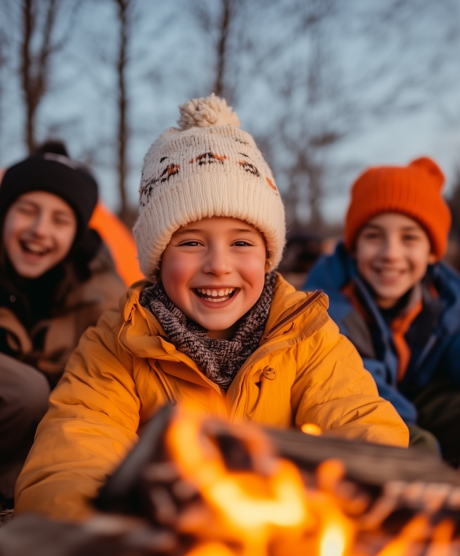Three children in winter attire enjoy a campfire, smiling warmly. Bright hats and jackets add color to the cozy outdoor scene.