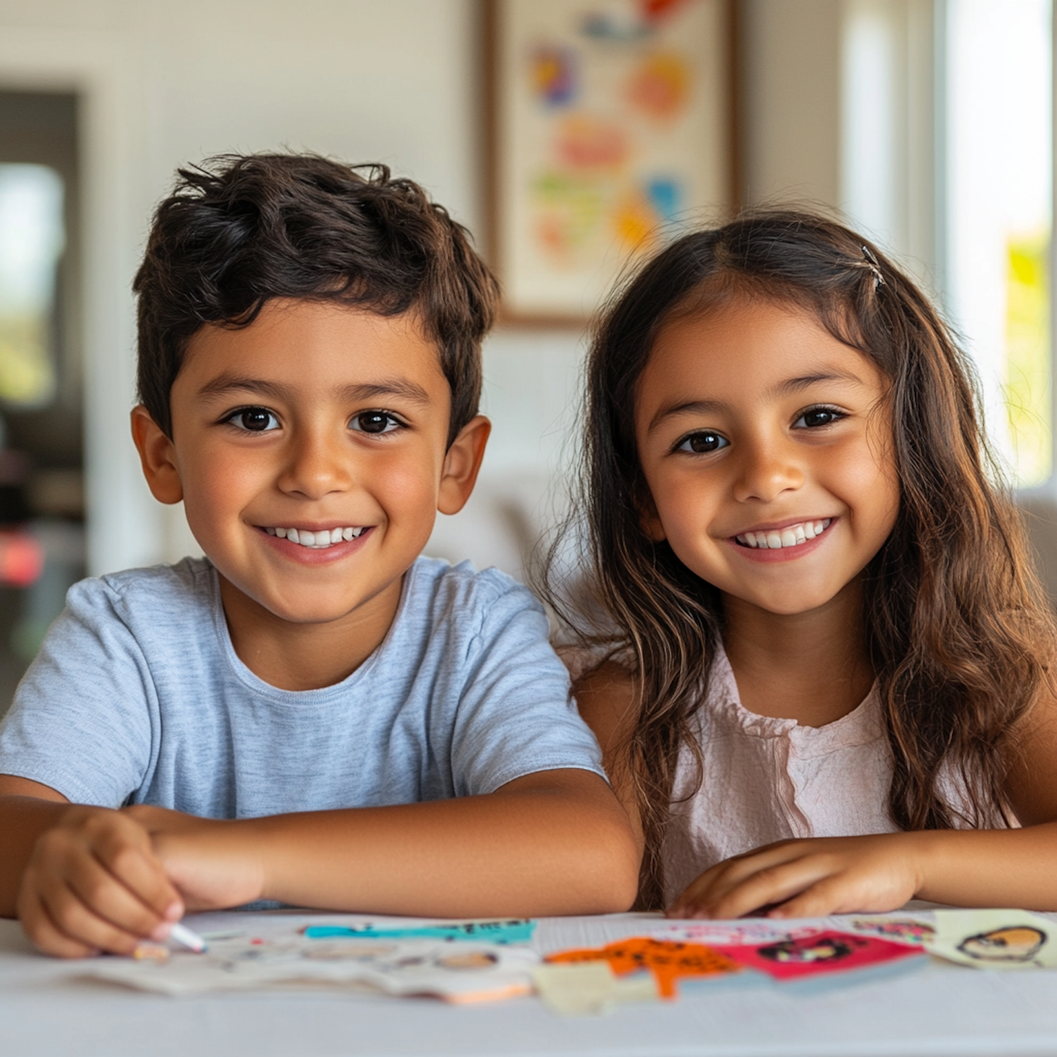 Two smiling children engaged in a creative activity with colorful paper cutouts on a table, in a cozy indoor setting.