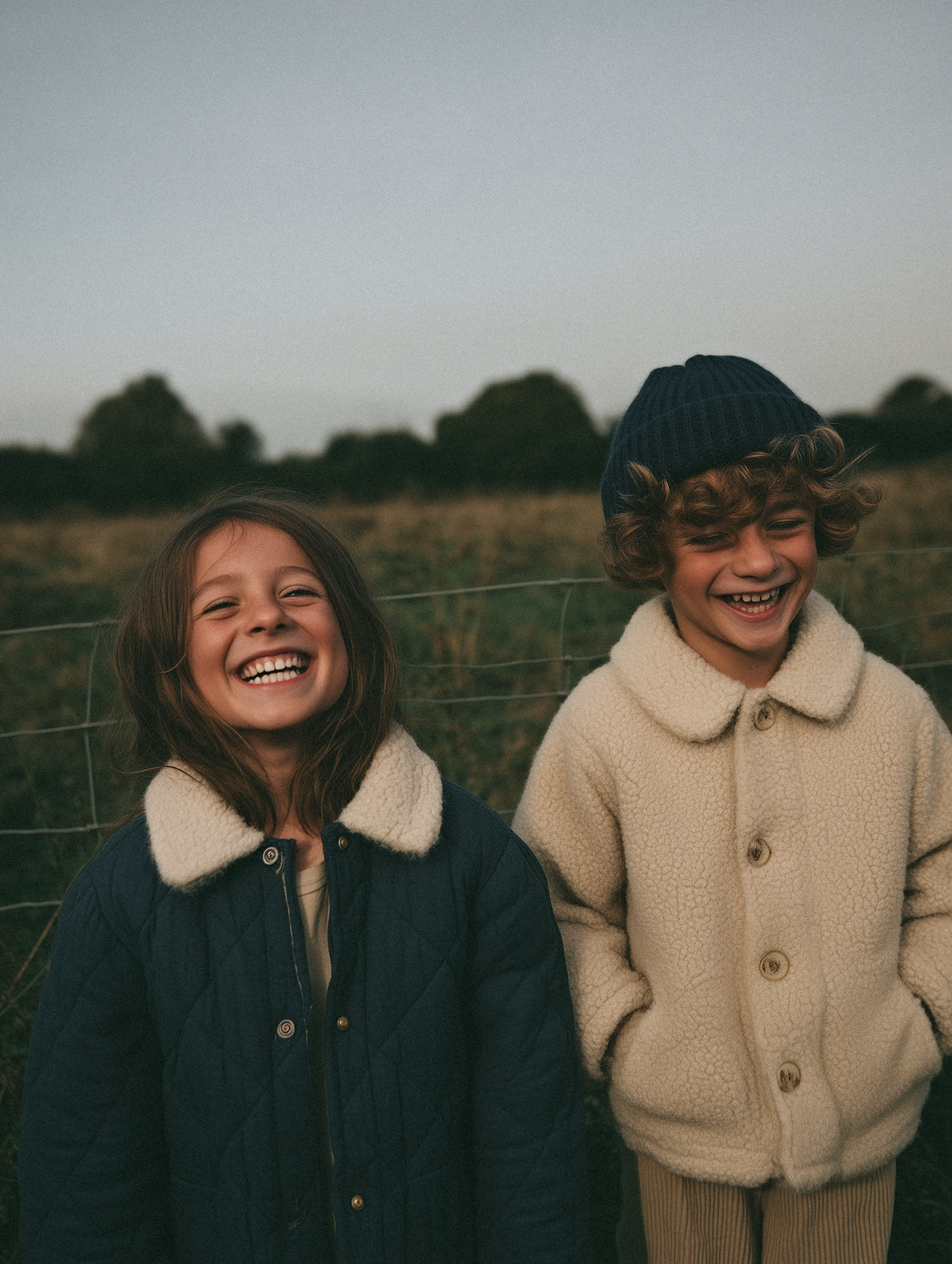 Two children smiling outdoors in cozy shearling jackets, enjoying a serene field setting under a clear sky.