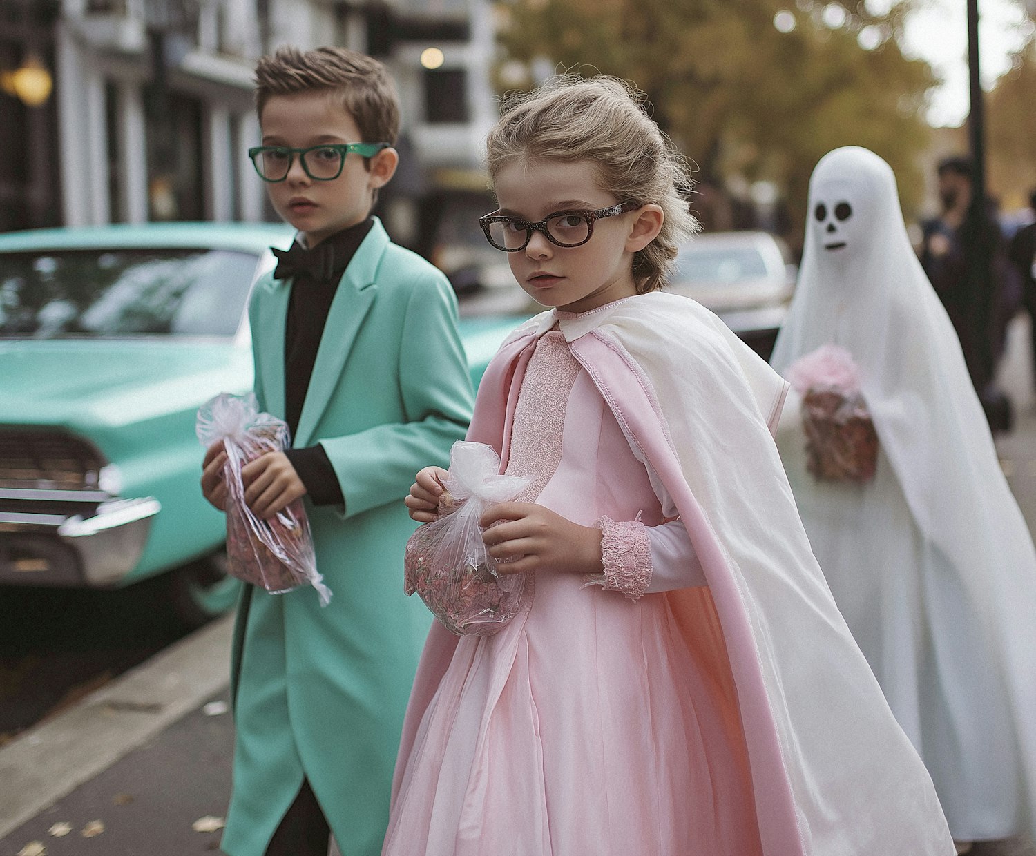 Children in Halloween costumes, including a mint green suit and pink dress, walk with candy bags on a suburban street.