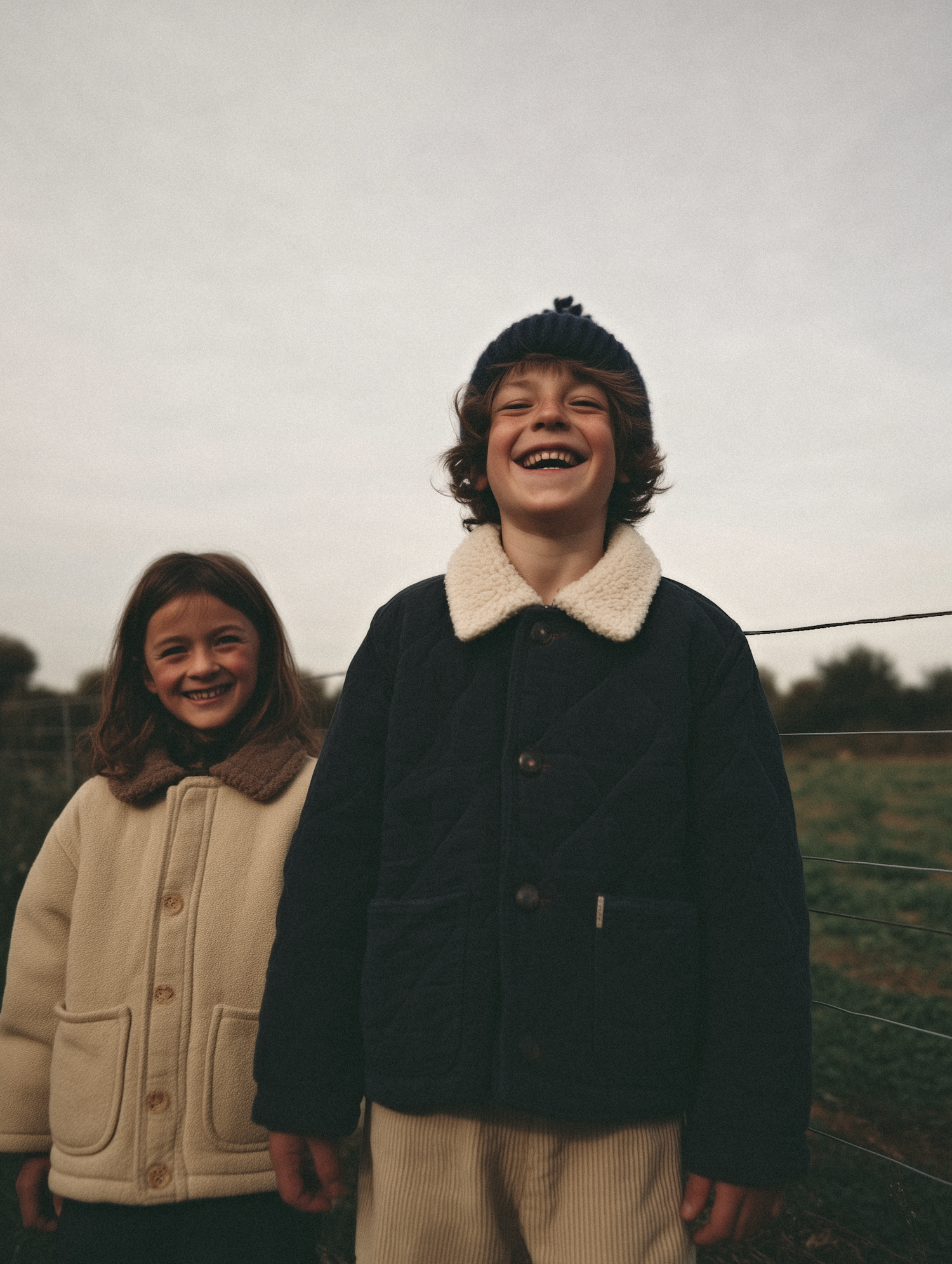 Two children smiling outdoors in warm coats, one in cream and the other in navy blue, with a rustic field in the background.