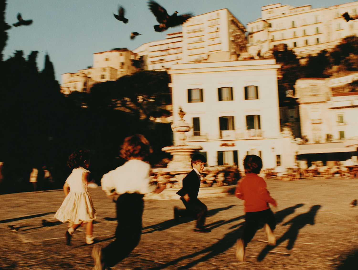 Children playing in a sunlit square with birds flying above, surrounded by warm-toned buildings and a lively atmosphere.