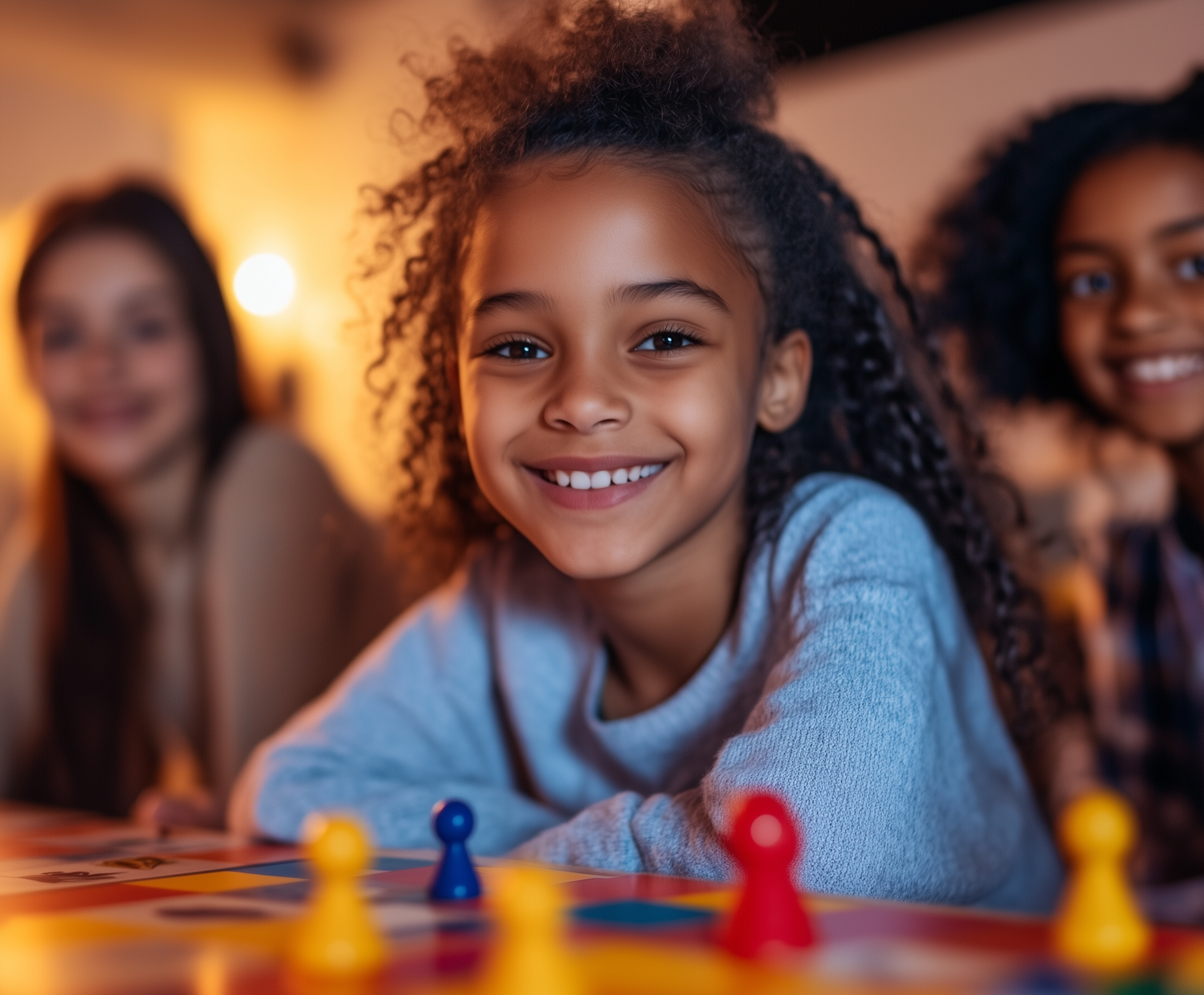 Smiling children playing a colorful board game, creating a joyful and engaging atmosphere with warm lighting.