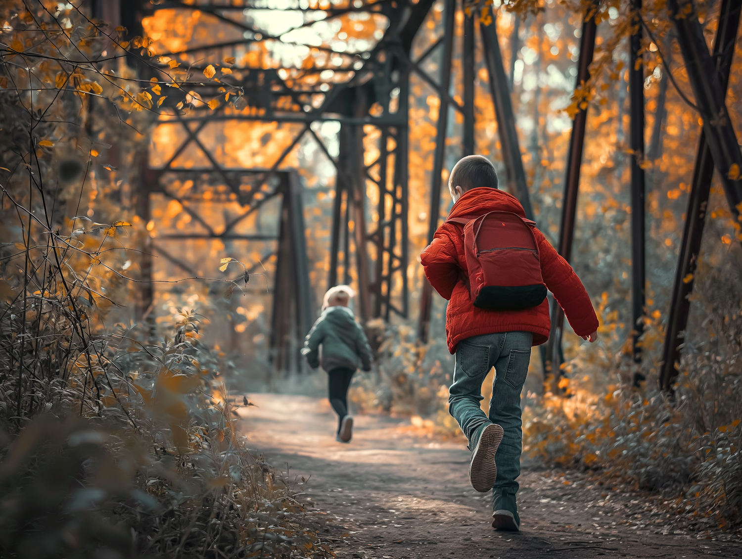 Children running on a rustic bridge surrounded by vibrant autumn foliage, wearing colorful jackets and backpacks.