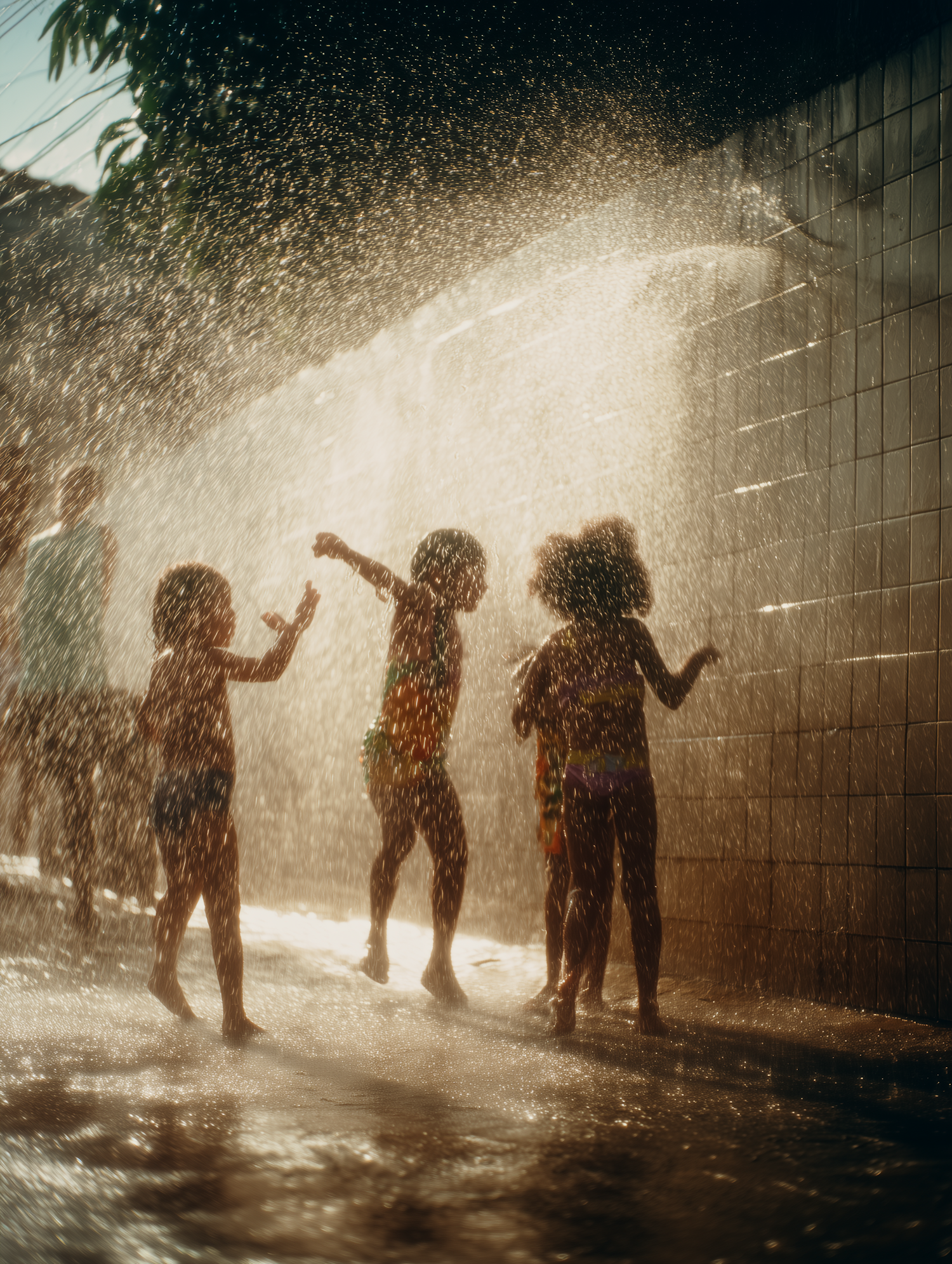 Children playing under a water spray, illuminated by sunlight, creating a joyful and vibrant scene of summer fun.